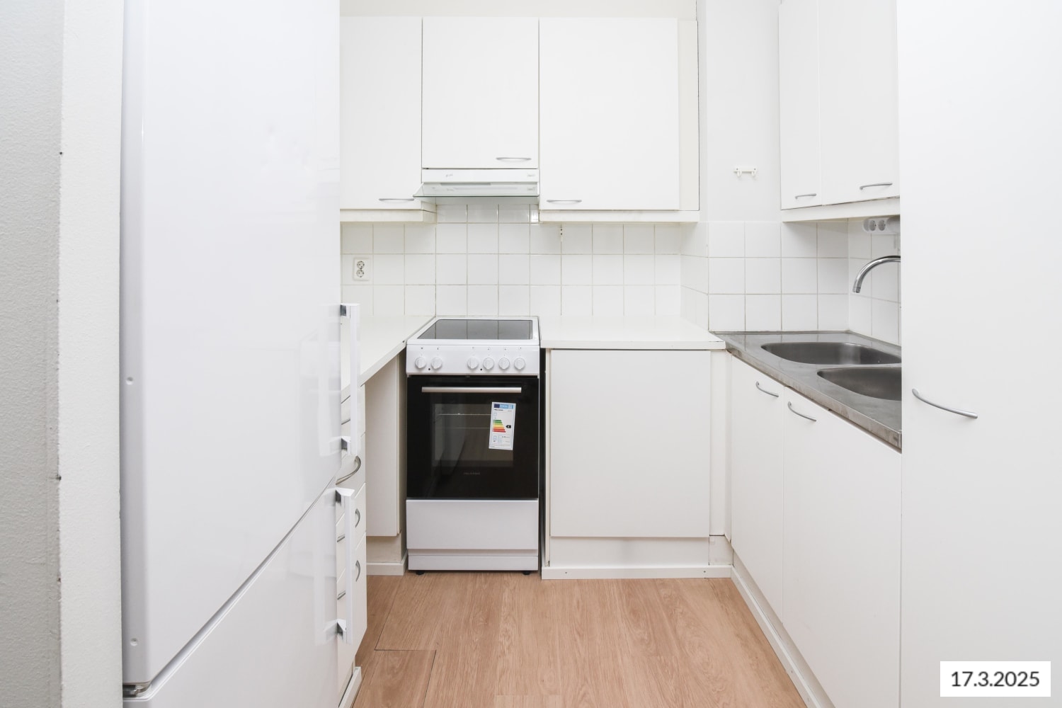 Keittokomerossa on jää-pakastinkaappi ja nelilevyinen sähköliesi. Huoneistossa on tilavaraus astian- ja pyykinpesukoneelle.