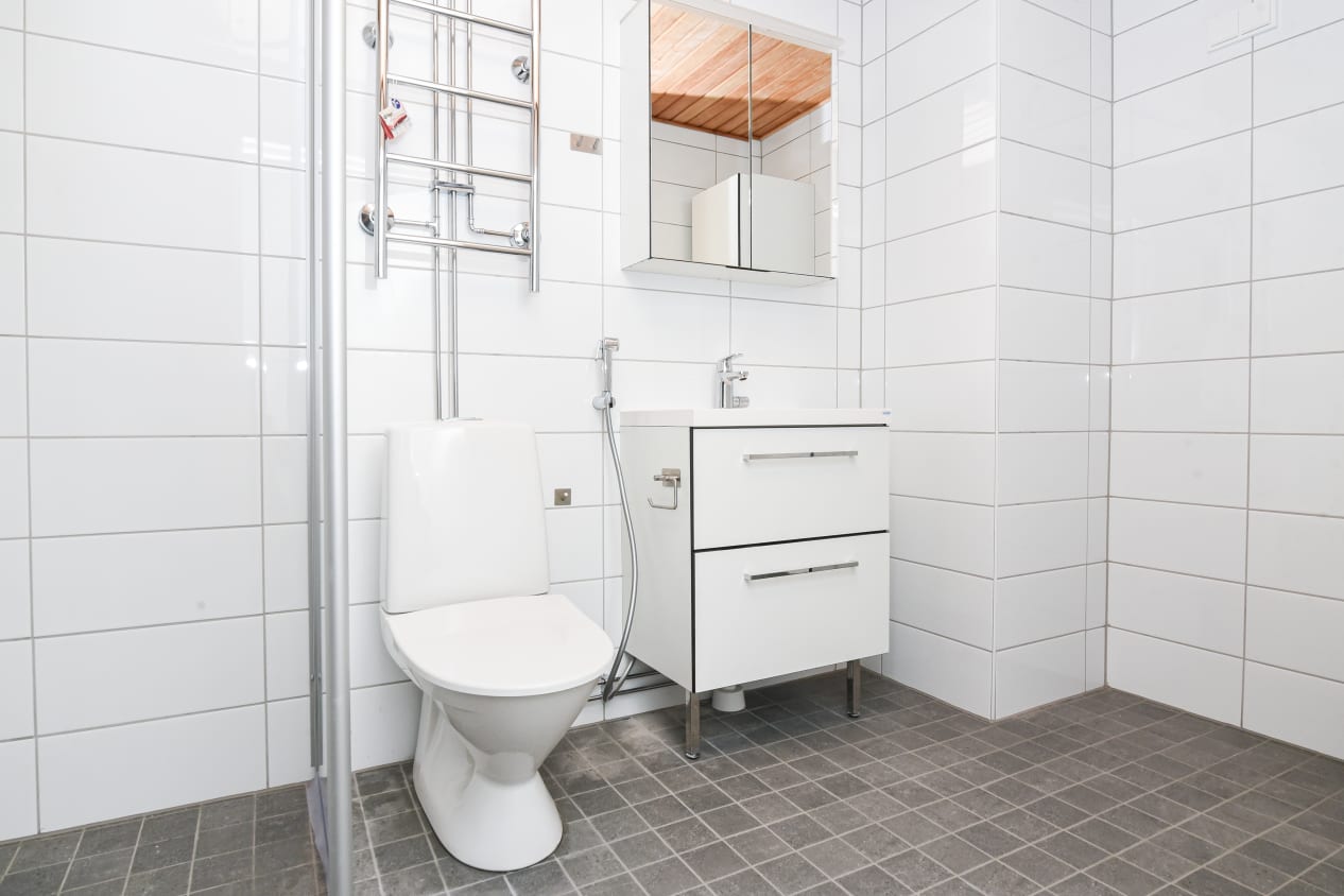 Kotikokin iloksi keittiöstä löytyy valmiina astianpesukone. Laatoitetussa kylpyhuoneessa on paikka pyykkikoneelle.