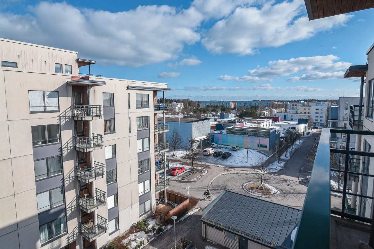 Ylimmän kerroksen vuokrakaksio on tutustumisen arvoinen: kulmahuoneiston rauhallisuus, erittäin toimiva pohjaratkaisu ja oma sauna tekevät kodista viihtyisän ja käytännöllisen. Pisteenä i:n päällä on kuitenkin tilava parveke, jolta avautuu esteetön näkymä pitkälle eteläkaakkoon yli Mustakiven koulun ja Mustankivenpuiston.