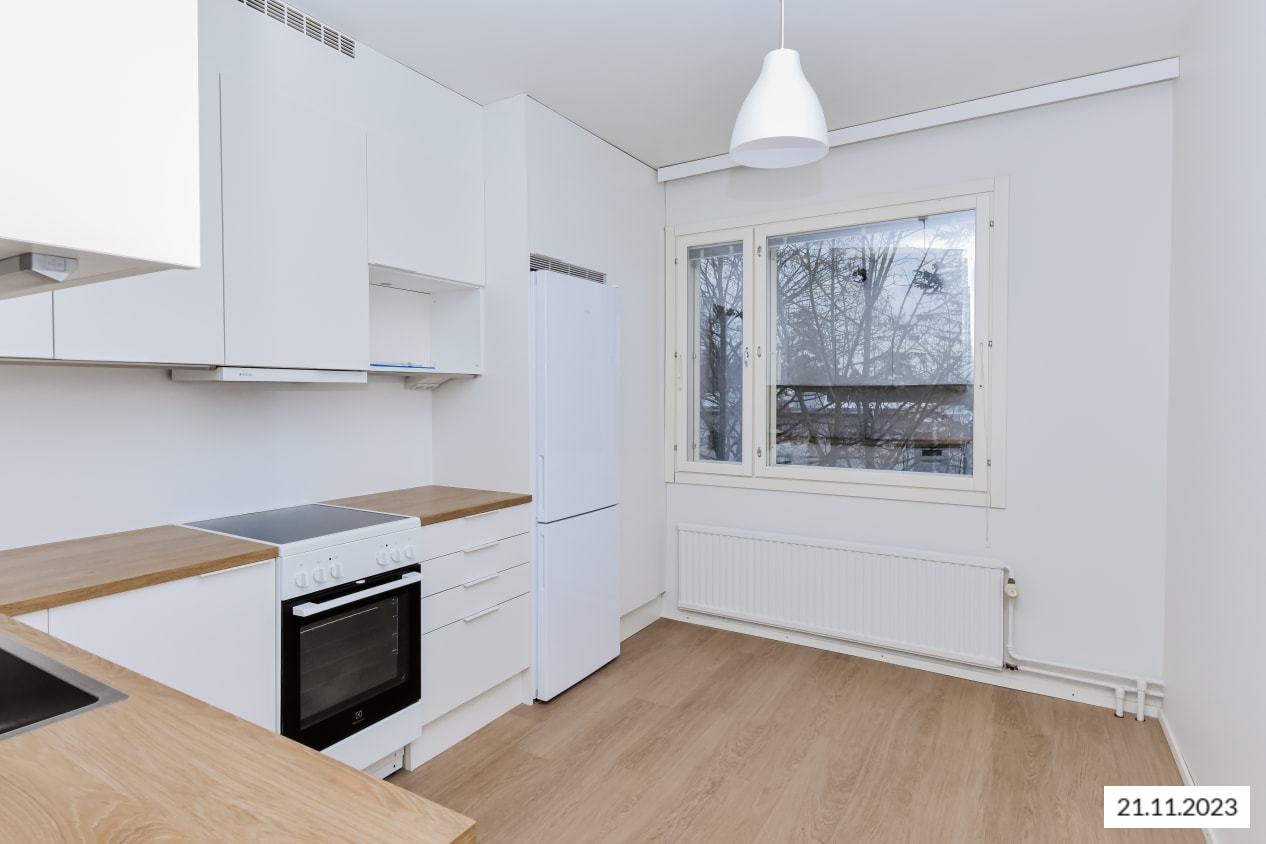 Reilun kokoisen kaksion erillisessä keittiössä on jää-pakastinkaappi, nelilevyinen liesi sekä varaus astianpesukoneelle. Makuuhuoneessa ja eteisessä on mukavasti kaappitilaa. Läpitalon huoneiston kruunaa oma parveke.