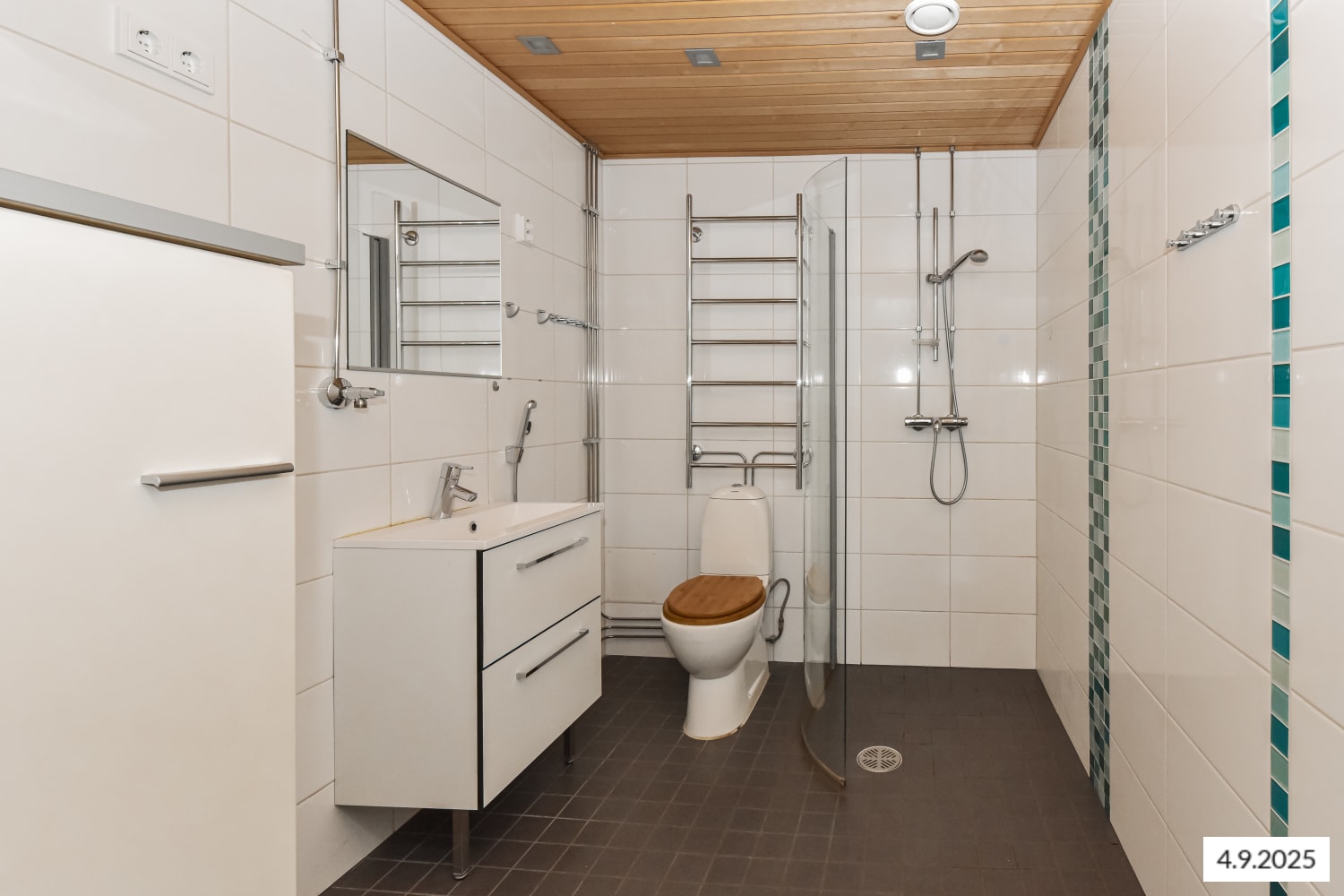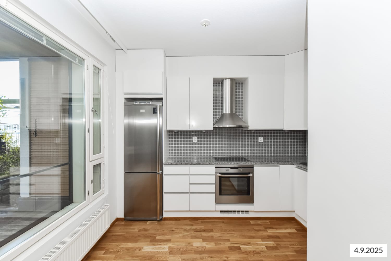 Asuinhuoneissa on kaunis tammiparkettilattia ja ikkunoissa vakiovarusteena sälekaihtimet. Kylpyhuoneessa on lattialämmitys, tummanharmaa lattialaatoitus ja raikkaan turkooseilla lasimosaiikkiboordeilla maustetut isot valkoiset seinäkaakelit. Keittiössä on rosterinen AEG:n jää-pakastinkaappi sekä mikroaaltouuni, integroitu astianpesukone ja keraaminen liesitaso uuneineen. Keittiön tasot ovat tyylikästä harmaata graniittia.
