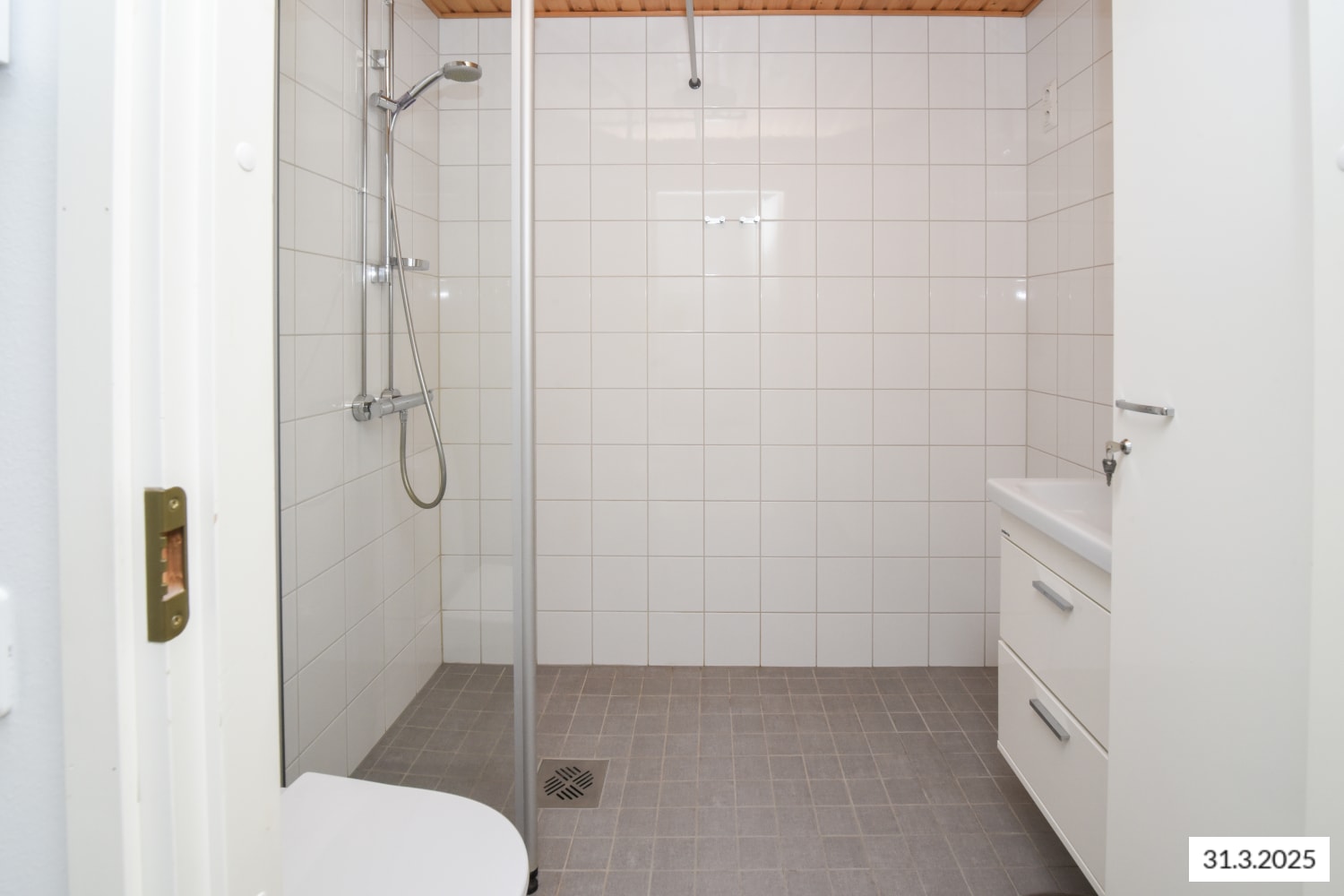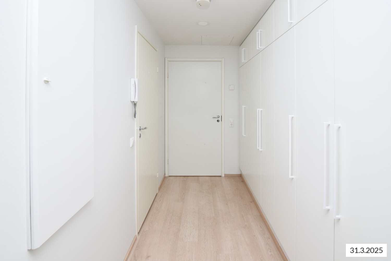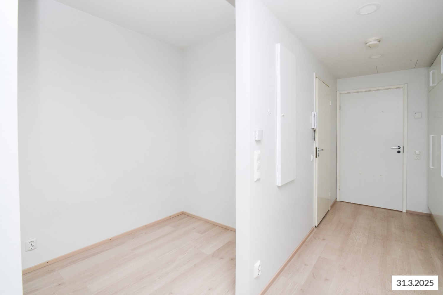 Asuintilojen lattiat ovat kodikkaasti tammilaminaattia. Seinät ja komerokalusteet ovat valkoisia. Keittiössä kaapistojen ovet ovat valkoiset ja ylä- ja alakaappien välisessä tilassa on valkoinen laatoitus. Työtaso on lattian sävyyn sointuvaa tammen sävyistä laminaattia. Varustukseen kuuluu keraaminen liesi, astianpesukone ja jääkaappipakastin. Kylpyhuoneessa seinät ovat valkoista ja lattiat hillityn harmaata laattaa. Vesikiertoinen lattialämmitys hellii jalkoja. Pesukoneelle ja kuivausrummulle on varaus.