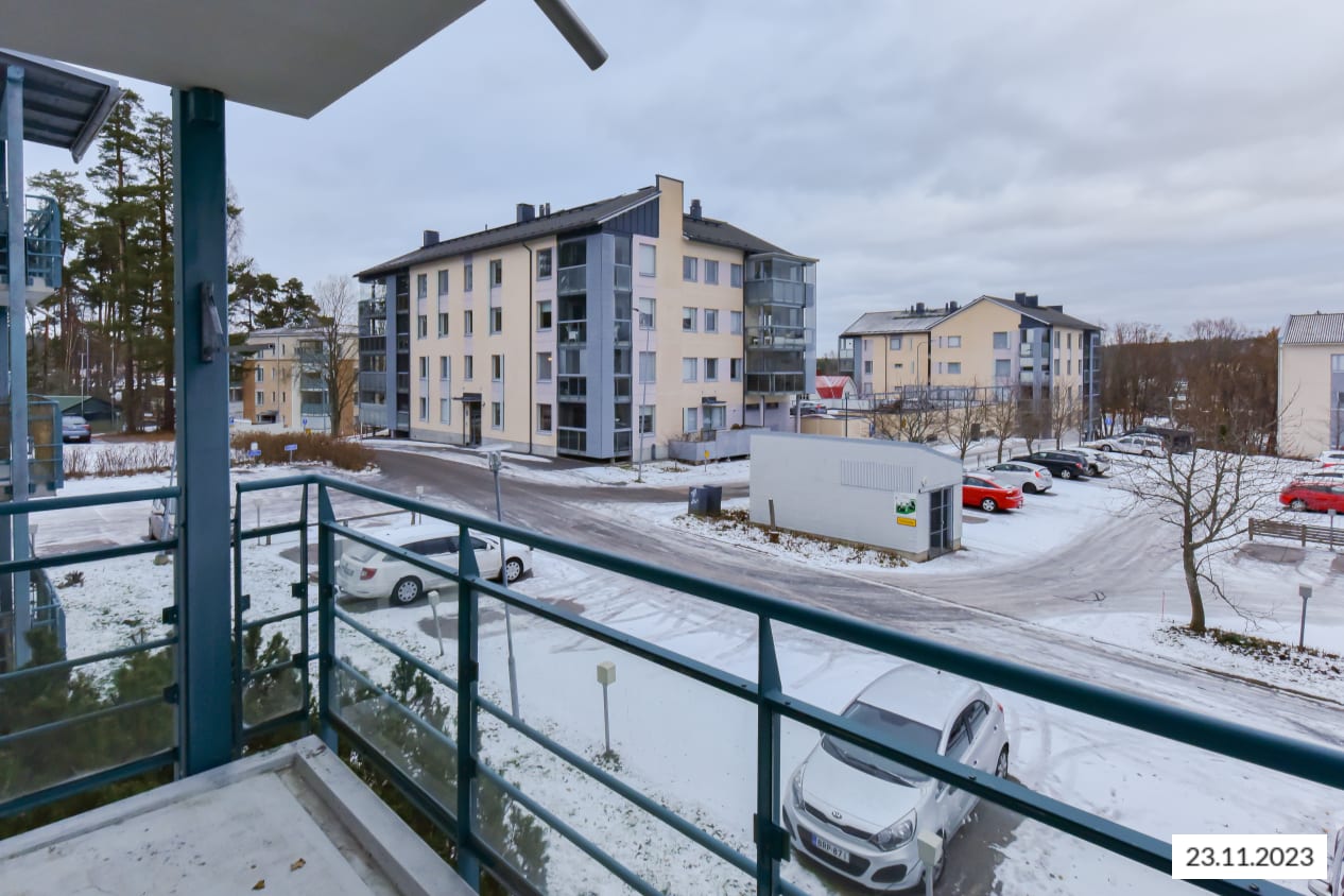 Kolmikerroksinen talo, jonka kaikissa asunnoissa on parvekkeet.