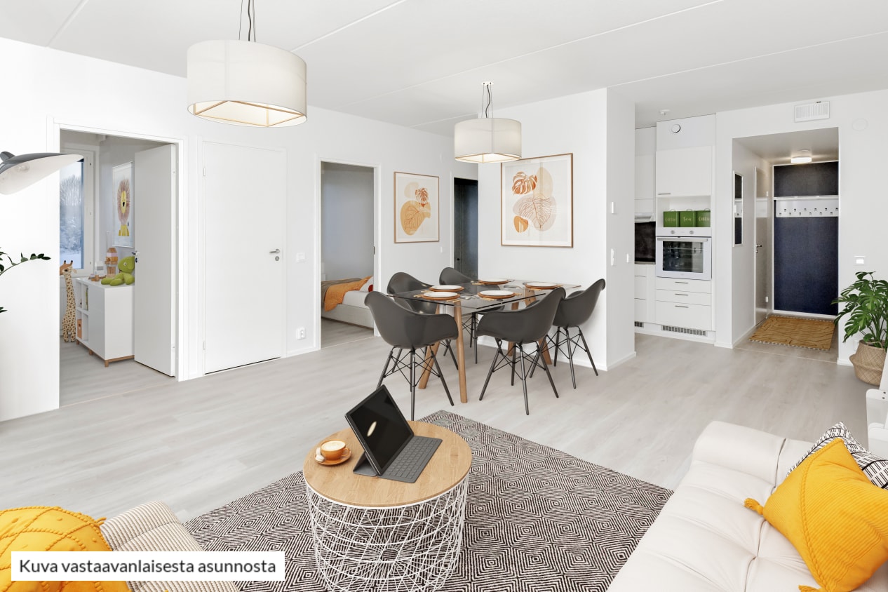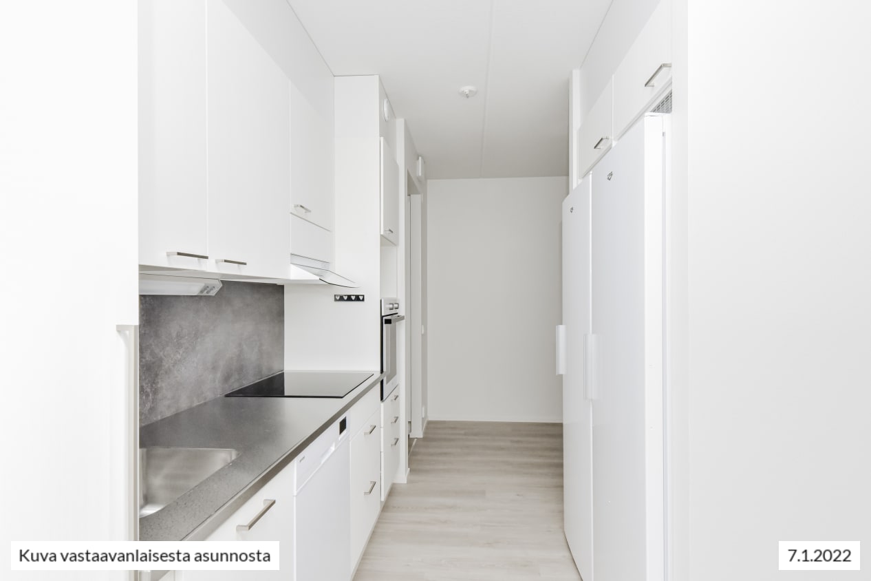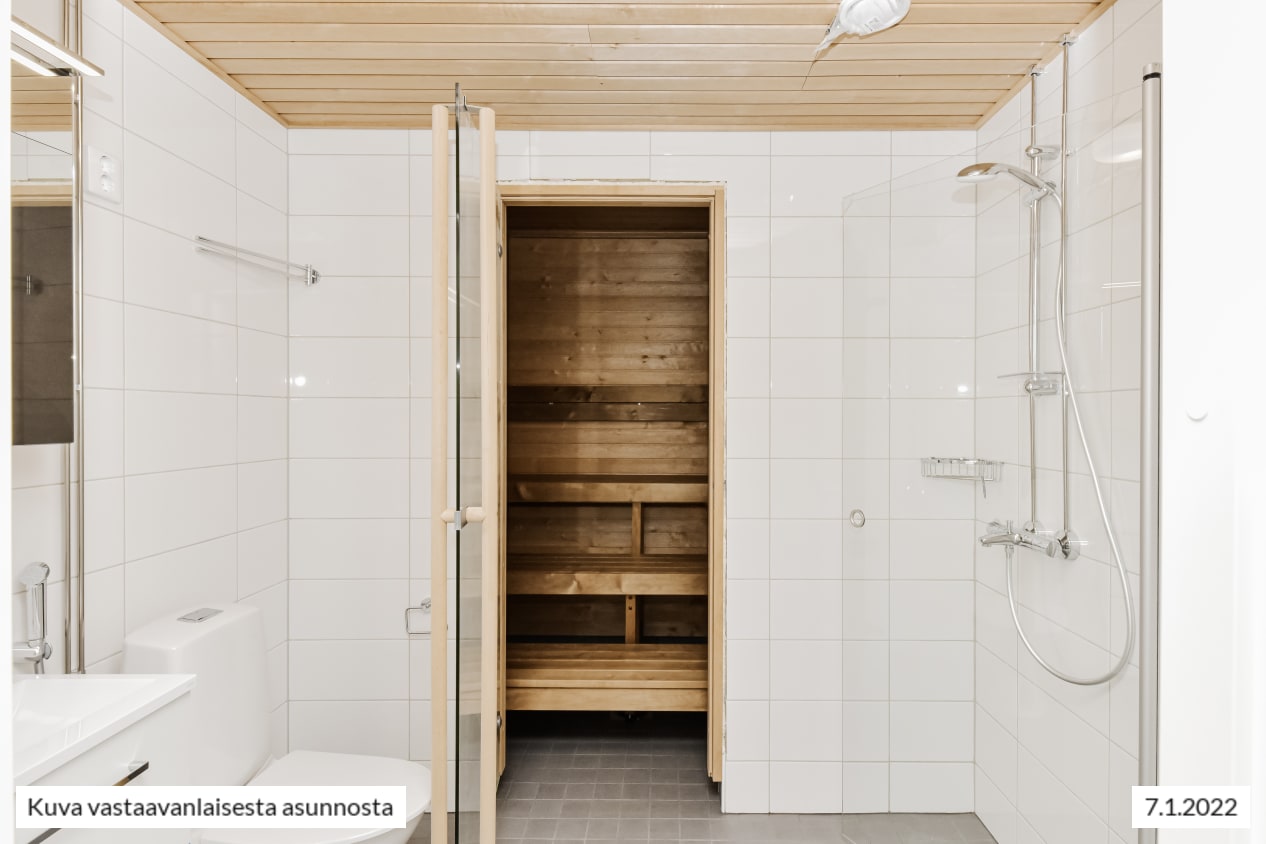 Keväällä 2022 valmistuneen, tilavan kodin olohuone ja avoin keittiö muodostavat yhtenäisen, helposti kalustettavan oleskelualueen, joka jatkuu aurinkoiselle lasitetulle parvekkeelle. Tilaan mahtuu mukavasti ruokailutila, johon sopii isompikin seurue. Kodin valttina on lisäksi oma sauna, jossa kelpaa rentoutua. Kaikki pintamateriaalit ovat vaaleita ja sopivat moneen makuun. Lattia on tammilaminaattia ja seinät on maalattu valkoisiksi. Keittiössä on valkoiset, puusyykuvioiset kaapistot. Ylä- ja alakaappien välinen tila on harmaata laminaattia. Varustukseen kuuluu keraaminen liesitaso, kalusteuuni, jääkaappi, pakastin ja astianpesukone. Kodinkoneet ovat valkoisia. Kylpyhuoneessa on valkoiset SATOn Kide-malliston kalusteet ja paikka pyykinpesukoneelle. Seinät ovat valkoista laattaa ja lattia on harmaa. Arkea helpottaa erillinen wc.
