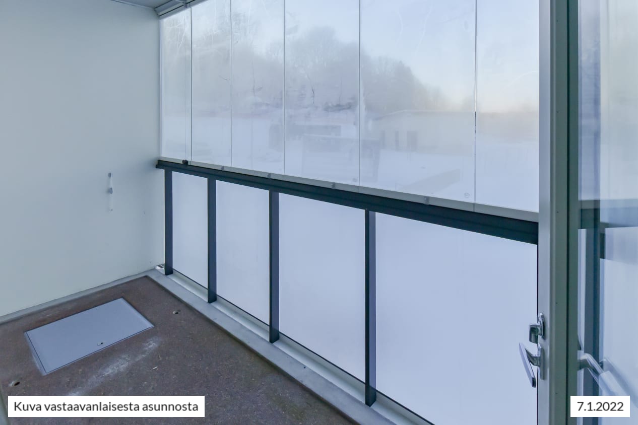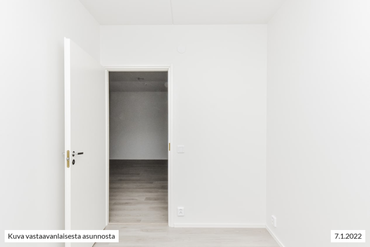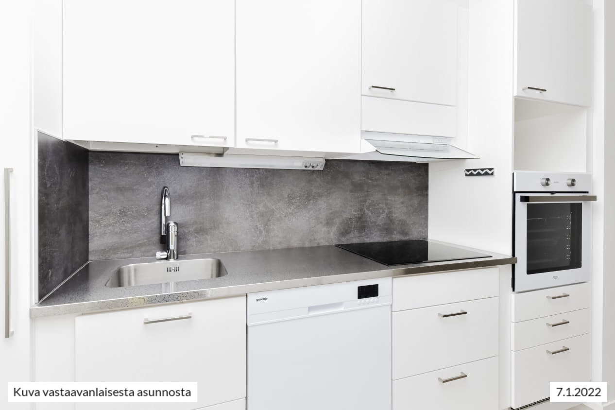 Keväällä 2022 valmistuneen, tilavan kodin olohuone ja avoin keittiö muodostavat yhtenäisen, helposti kalustettavan oleskelualueen, joka jatkuu aurinkoiselle lasitetulle parvekkeelle. Tilaan mahtuu mukavasti ruokailutila, johon sopii isompikin seurue. Kodin valttina on lisäksi oma sauna, jossa kelpaa rentoutua. Kaikki pintamateriaalit ovat vaaleita ja sopivat moneen makuun. Lattia on tammilaminaattia ja seinät on maalattu valkoisiksi. Keittiössä on valkoiset, puusyykuvioiset kaapistot. Ylä- ja alakaappien välinen tila on harmaata laminaattia. Varustukseen kuuluu keraaminen liesitaso, kalusteuuni, jääkaappi, pakastin ja astianpesukone. Kodinkoneet ovat valkoisia. Kylpyhuoneessa on valkoiset SATOn Kide-malliston kalusteet ja paikka pyykinpesukoneelle. Seinät ovat valkoista laattaa ja lattia on harmaa. Arkea helpottaa erillinen wc.