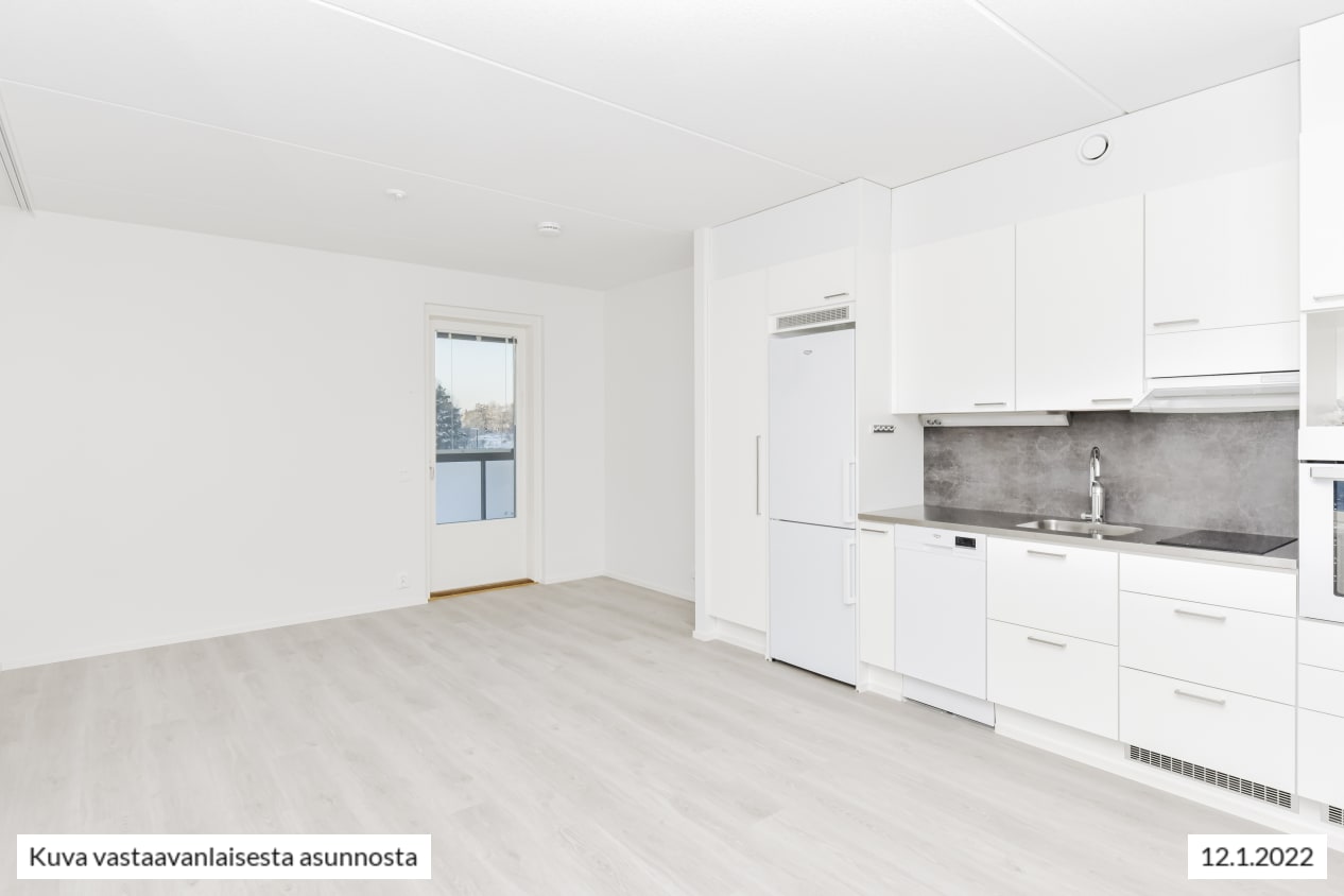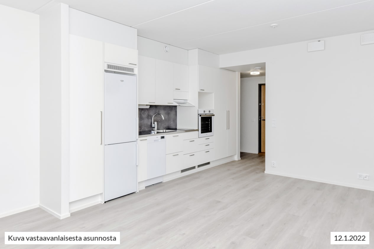 Keväällä 2022 valmistunut yksiö on talon päädyssä ja siitä avautuu näkymät kahteen ilmansuuntaan. Selkeän pohjaratkaisun ja ajattomien vaaleiden pintamateriaalien ansiosta koti on helppo kalustaa mieluisaksi. Kodin pintamateriaalit ovat vaaleita ja sopivat moneen makuun. Lattia on tammilaminaattia ja seinät on maalattu valkoisiksi.