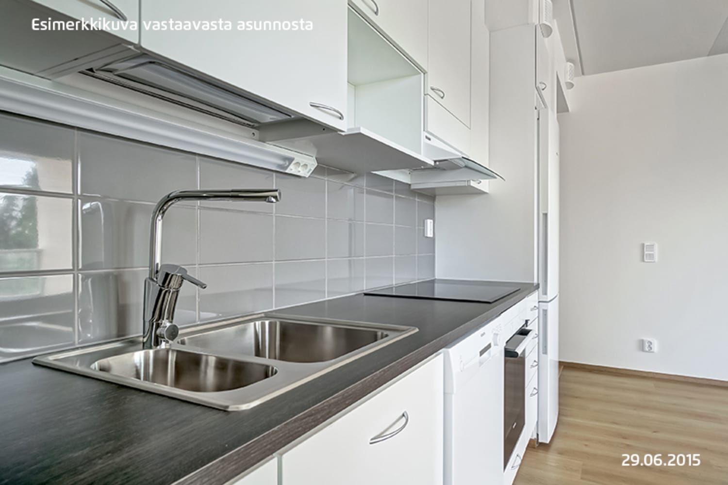 Vaaleasävyisen kodin lattiat ovat tyylikästä tammea mukailevaa laminaattia. Keittiökalusteiden ovet ovat raikkaan valkoiset ja kaapistojen välinen tila on laatoitettu harmaalla laatalla. Laminaattityötaso on tumman puun sävyinen. Varustukseen kuuluu keraaminen liesitaso, kalusteuuni, astianpesukone ja kylmälaitteet. Kodinkoneet ovat valkoisia. Kylpyhuoneiden seinät on laatoitettu kiiltävän valkoisilla laatoilla, joihin ryhtiä tuo tehosteseinän tumman harmaa laatoitus. Myös lattiat ovat väriltään tumman harmaat. Kylpyhuoneen kaapit ovat valkoiset. Pesukoneelle ja kuivausrummulle on tilavaraus.