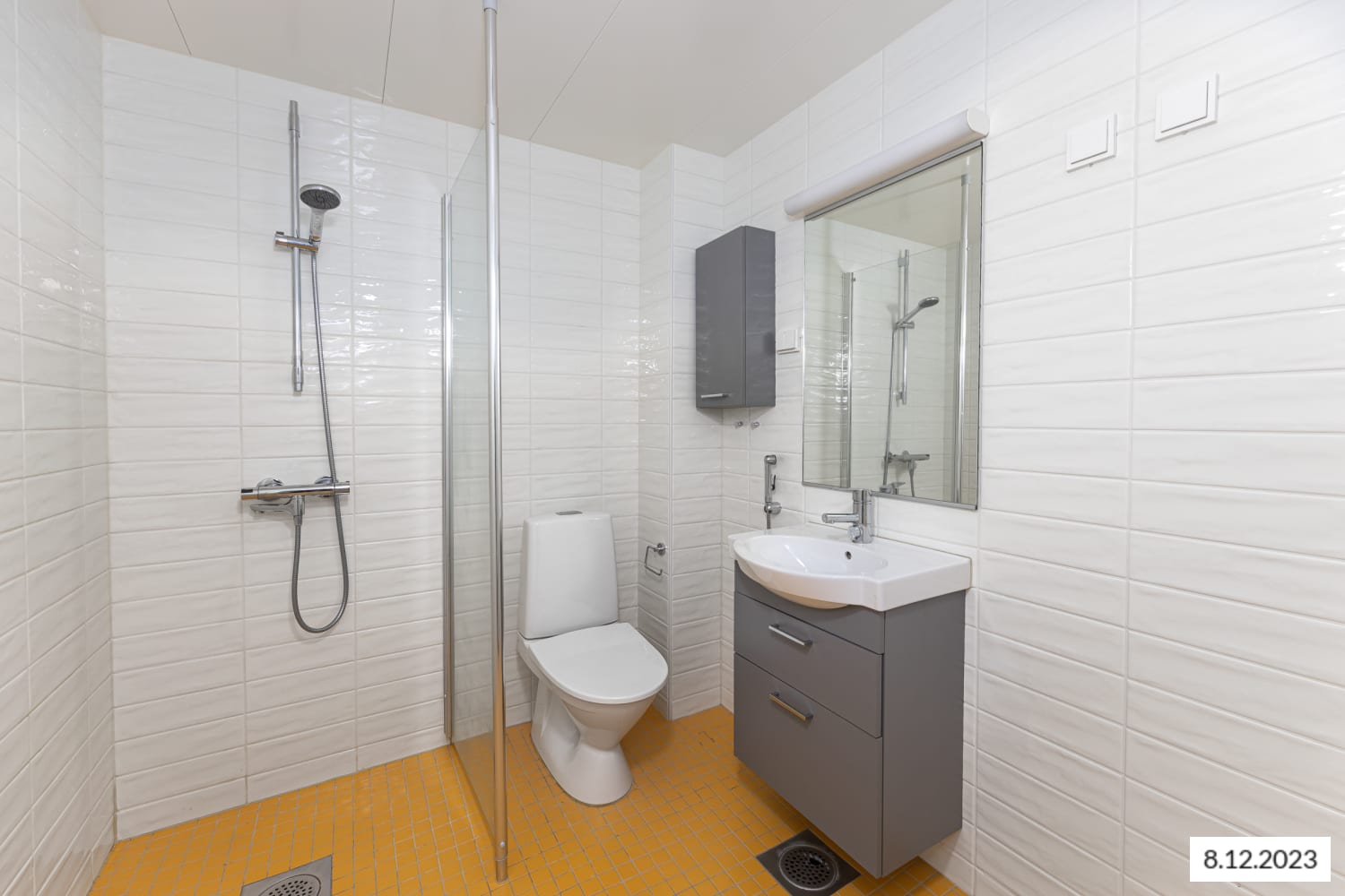 Asuintilojen lattiat ovat valkaistun tammen sävyistä laminaattia. Keittiön kaapistojen ovet ovat raikkaan valkoiset ja ylä- ja alakaappien välinen tila on laatoitettu mausteisen keltaisella. Työtaso on vaalean tammen sävyistä laminaattia. Varustukseen kuuluu keraaminen liesi, astianpesukone ja kylmälaitteet. Kokonaan laatoitetun kylpyhuoneen seinät ovat puhtaan valkoiset ja lattia keltainen. Kylpyhuoneen kalusteet ovat vaalean harmaita. Pesukoneelle ja kuivausrummulle on tilavaraus.