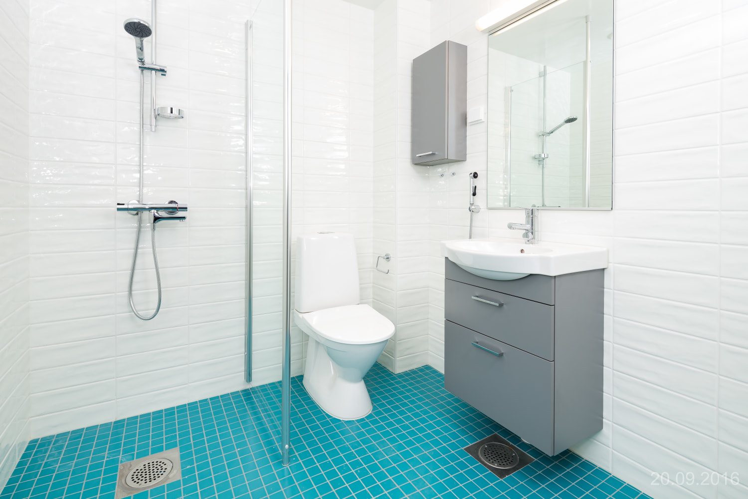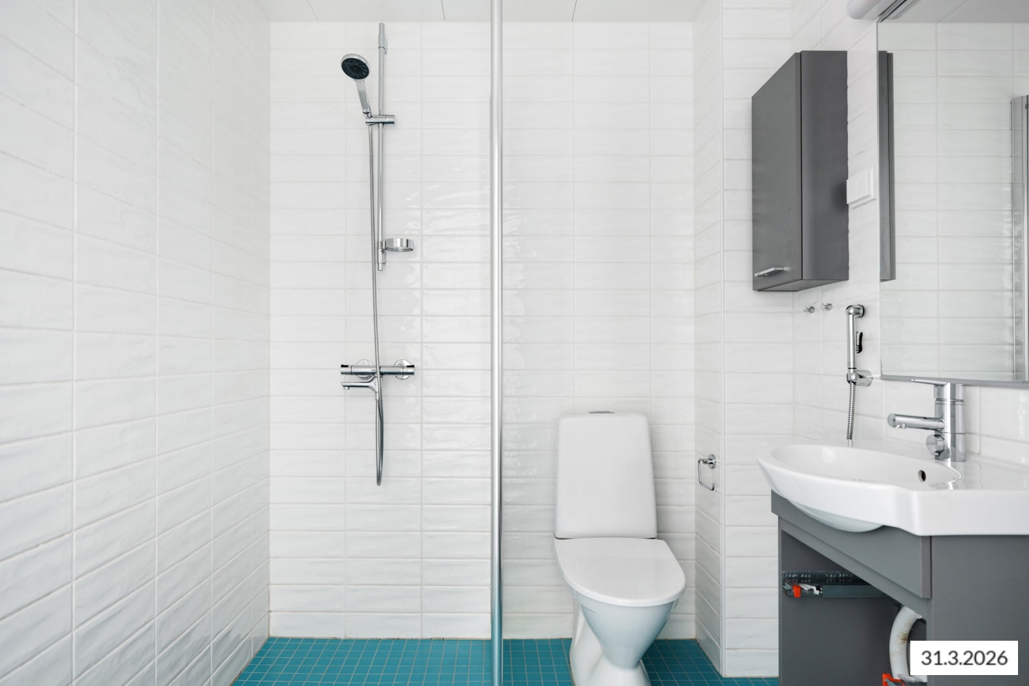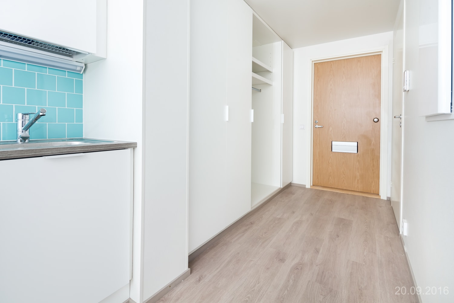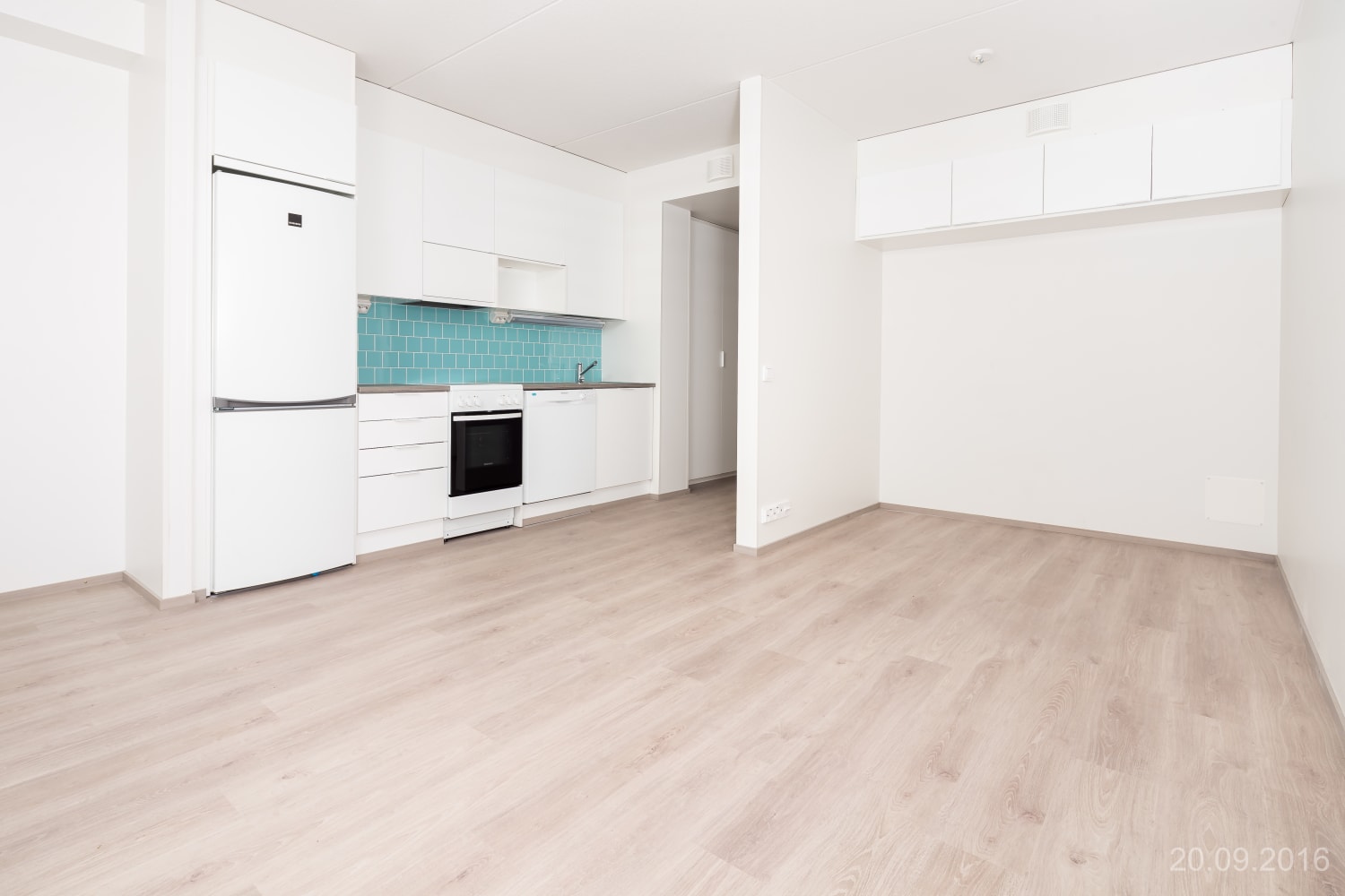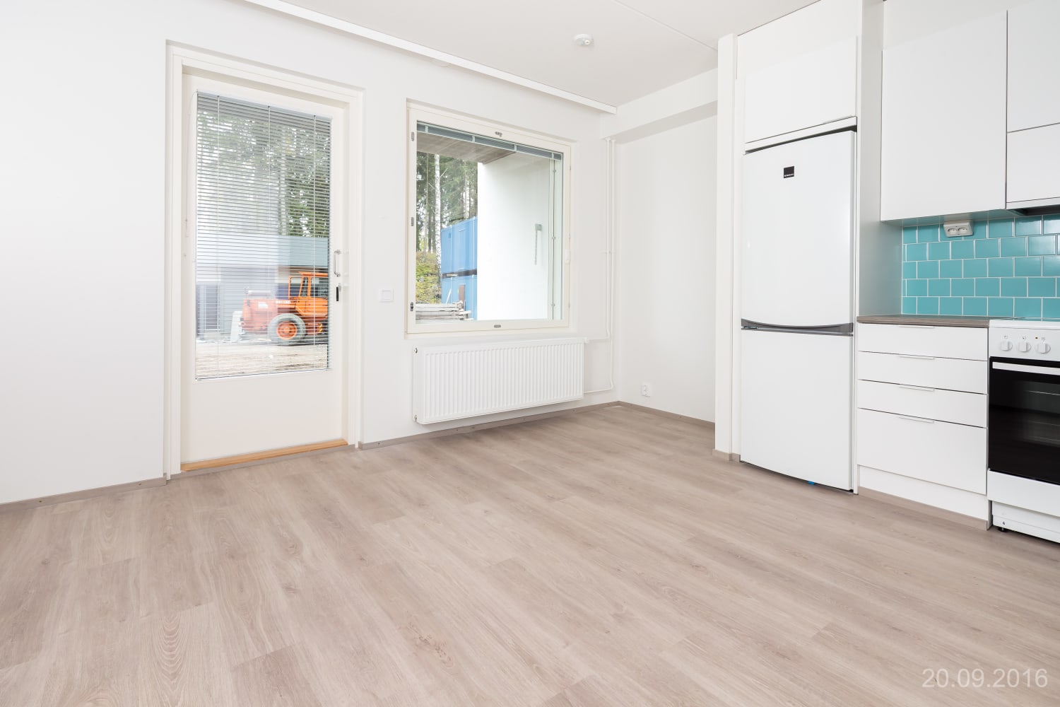 Asuintilojen lattiat ovat vaalean harmaata tammilaminaattia. Keittiön kaapistojen ovet ovat raikkaan valkoiset ja ylä- ja alakaappien välinen tila on laatoitettu vaalealla veden vihreällä laatalla. Työtaso on harmaan tammen sävyistä laminaattia. Varustukseen kuuluu keraaminen liesi, astianpesukone ja kylmälaitteet. Kokonaan laatoitetun kylpyhuoneen seinät ovat puhtaan valkoiset ja lattia turkoosi. Kylpyhuoneen kalusteet ovat vaalean harmaita. Pesukoneelle ja kuivausrummulle on tilavaraus.