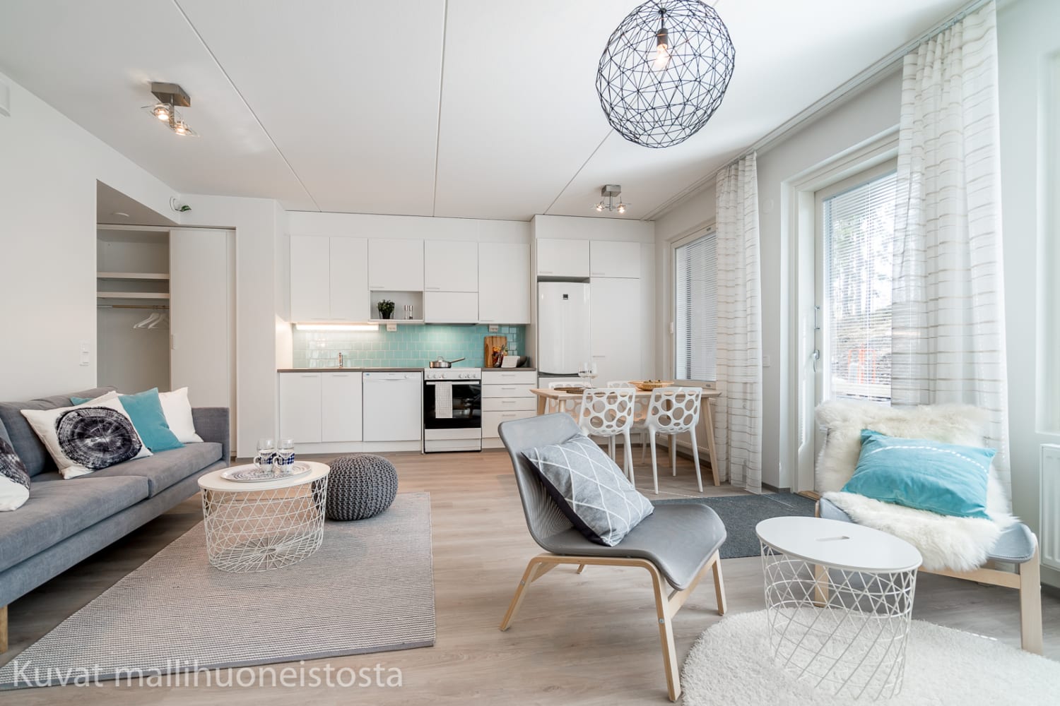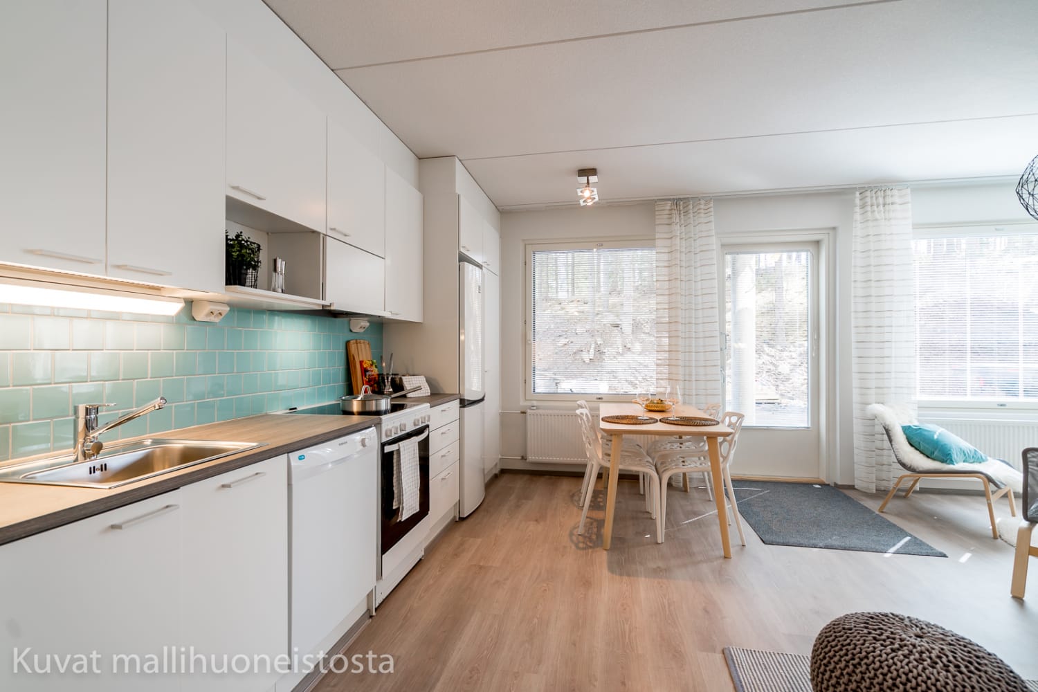 Asuintilojen lattiat ovat vaalean harmaata tammilaminaattia. Keittiön kaapistojen ovet ovat valkoiset ja ylä- ja alakaappien välinen tila on laatoitettu turkoosilla laatalla. Työtaso on harmaan tammen sävyistä laminaattia. Varustukseen kuuluu keraaminen liesi, astianpesukone ja kylmälaitteet. Kokonaan laatoitetun kylpyhuoneen seinät ovat valkoiset ja lattia turkoosi. Kylpyhuoneen kalusteet ovat harmaita. Pesukoneelle on tilavaraus.