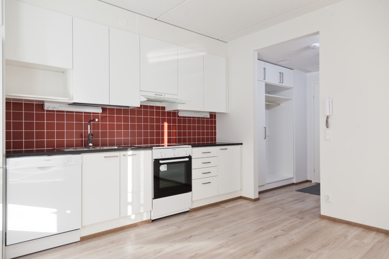 Asuinhuoneiden lattiamateriaalina on pinjan sävyinen laminaatti. Keittiön kaapistot ovat raikkaan valkoiset ja niitä piristää paprikan punainen välitilalaatoitus. Työtaso on tumman harmaata laminaattia. Keittiön varusteina on astianpesukone, keraaminen liesi ja jääkaappipakastin.