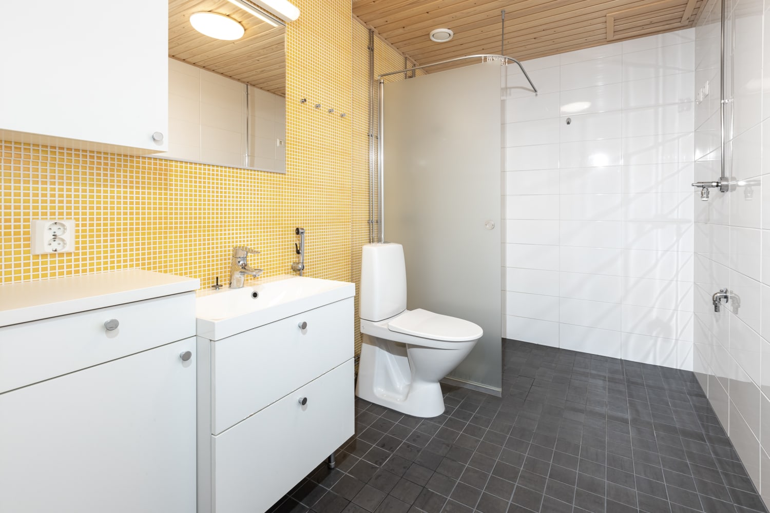 Kylpyhuoneessa seinät ovat pääosin valkoista ja lattiat harmaata laattaa. Harmonista värimaailmaa piristää keltainen mosaiikkilaatta tehosteseinässä. Pesukoneelle ja pyykinkuivaajalle on varaus.