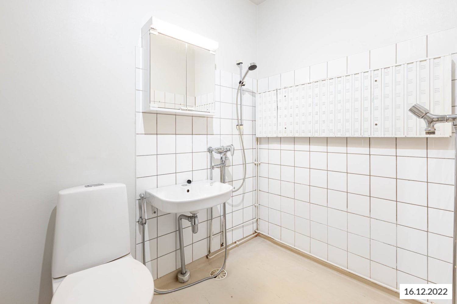 Keittiössä on perinteinen liesi ja jääkaappi, astianpesukoneellesikin on tilaa. osittain kaakeloidussa kylpyhuoneessa on tilavaraus pyykinpesukoneelle.