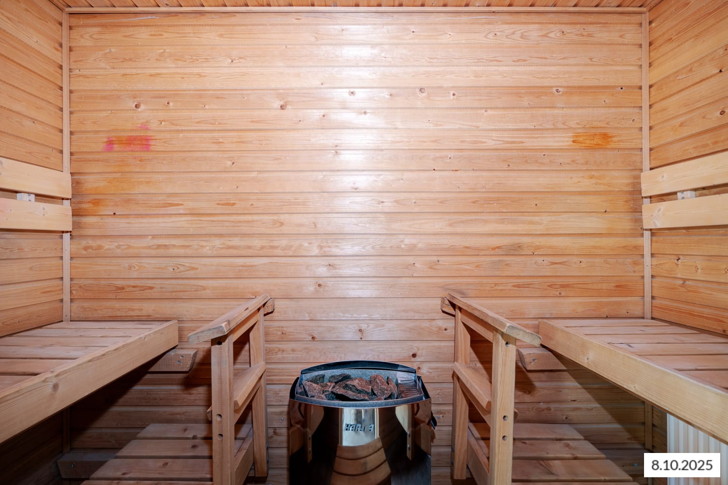 Pisteenä i:n päälle on ikioma sauna, jossa voi rentoutua ja palautua. Kaakeloidussa kylpyhuoneessa on paikka ja liitännät pesukoneelle. Kodin vaaleasävyiset materiaalit toimivat neutraalina pohjana mille tahansa sisustustyylille.