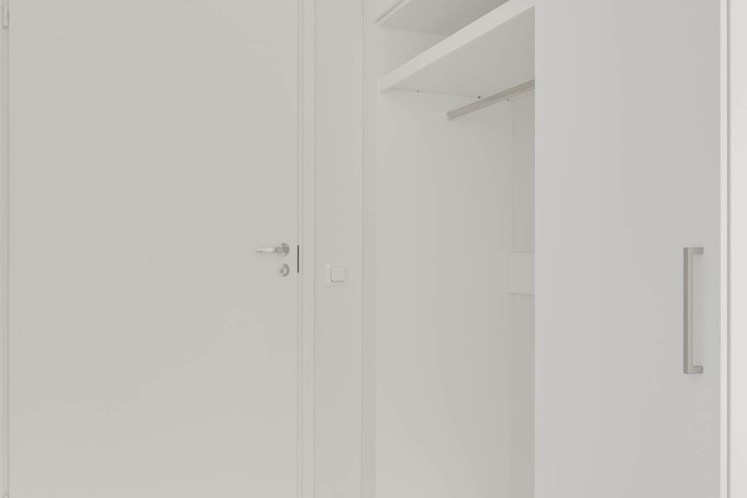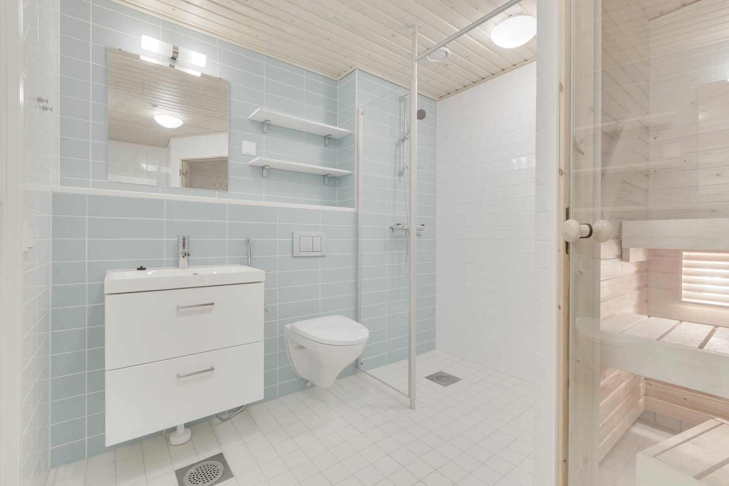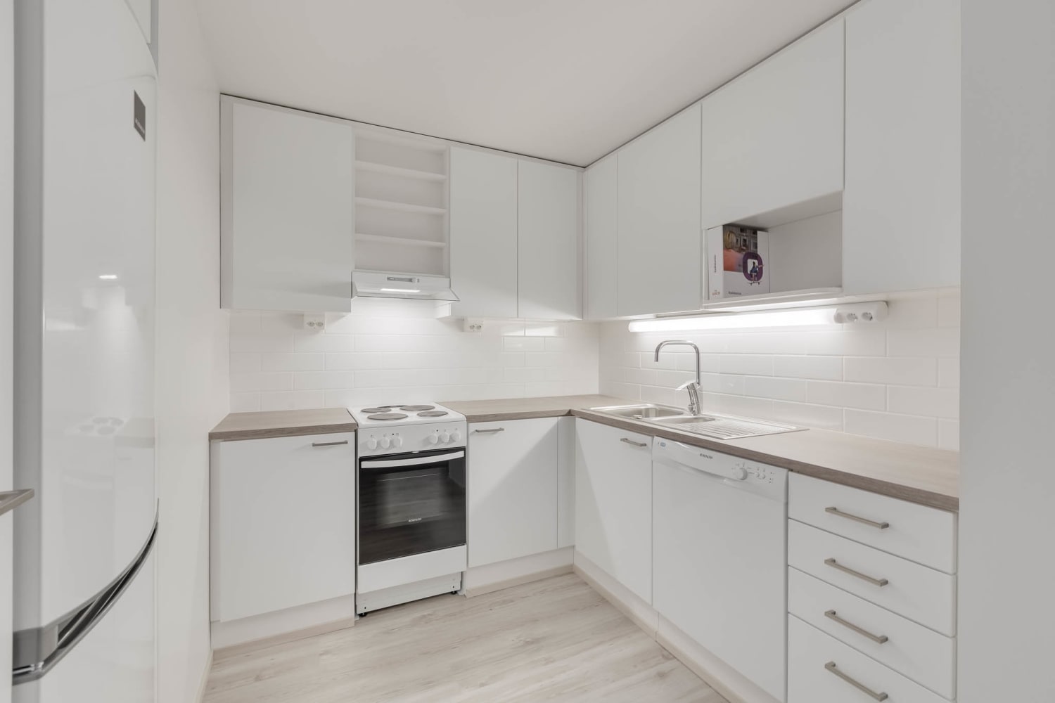 Vaaleasävyisen kaksion lattiat ovat leveää pinjan sävyistä lankkua mukailevaa laminaattia. Keittiöissä on valkoiset kaapistot ja vaalean puun väriset laminaattityötasot upotettuine teräksisine tiskialtaineen. Kaapistojen ja tason välinen tila on laatoitettu valkoisella laatalla. Keittiön varusteisiin kuuluu liesi, astianpesukone, jääkaappipakastin sekä varaus mikroaaltouunille. Kodinkoneet ovat valkoisia. Kylpyhuoneessa on isot valkoiset seinälaatat, joita elävöittää turkoosilla laatoitettu tehosteseinä. Lattialaatoitus on väriltään luonnonvalkoinen. Pyykinpesukoneelle ja kuivausrummulle on varaus.