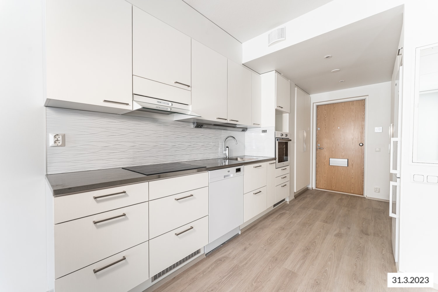 Sympaattisessa kaksiossa kaikelle löytyy oma paikkansa: selkeä tilanjako tarjoaa useita vaihtoehtoja sisustaa kodista juuri omannäköinen. Arjen sujuvuutta lisää makuuhuoneen suuri vaatehuone ja säilytystilaa löytyy myös eteisestä. Kesällä voit jatkaa oleskelutilaa omalle, lasitetulle parvekkeelle. Tehopohjaisessa kylpyhuoneessa on paikka ja liitännät pesukoneelle. Kodin vaaleasävyiset materiaalit toimivat neutraalina pohjana mille tahansa sisustustyylille. Olisiko tämä sinun uusi vuokrakotisi?