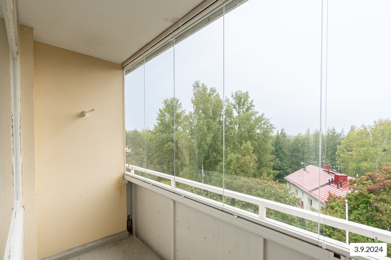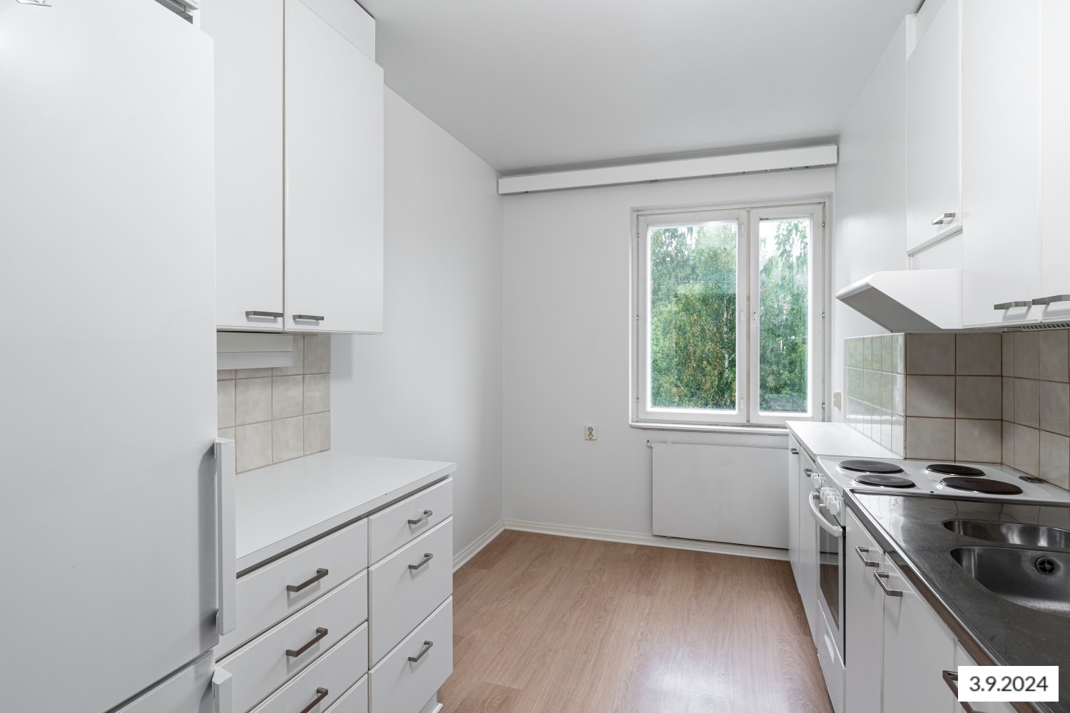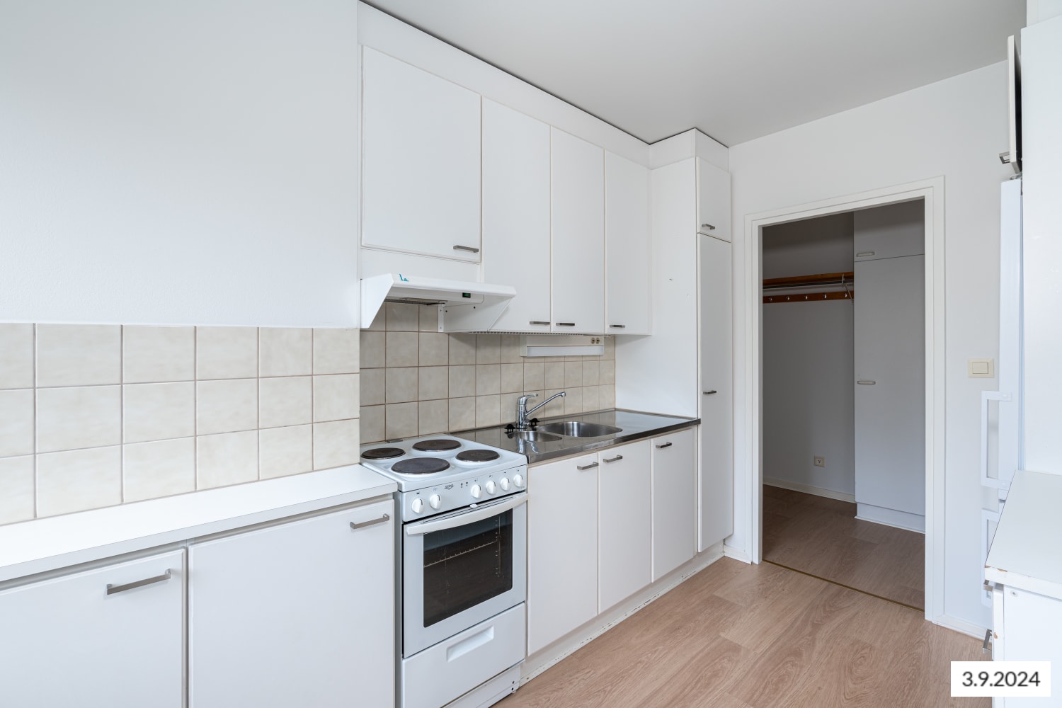 Vaaleasävyisen kaksion pohjaratkaisu on käytännöllinen ja helposti oman maun mukaan kalustettava. Lasitettu parveke tarjoaa valoisuutta sekä viihtyisää lisätilaa oleskeluun pitkälle keväästä syksyyn saakka. Kodissa on erillinen keittiö, jonka varustukseen kuuluu jääkaappipakastin, lattiauuni ja liesi. Keittiöön menee näppärästi myös pienempi ruokapöytä.