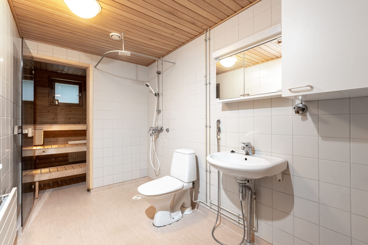 Keittiön kodin koneet ovat valkoisia ja ylä- ja alakaappien välinen tila on tyylikästä tummanharmaata laminaattia. Varustukseen kuuluu jääkaappipakastin, lattiauuni ja perinteinen liesi. Astianpesukone on mahdollista asentaa.