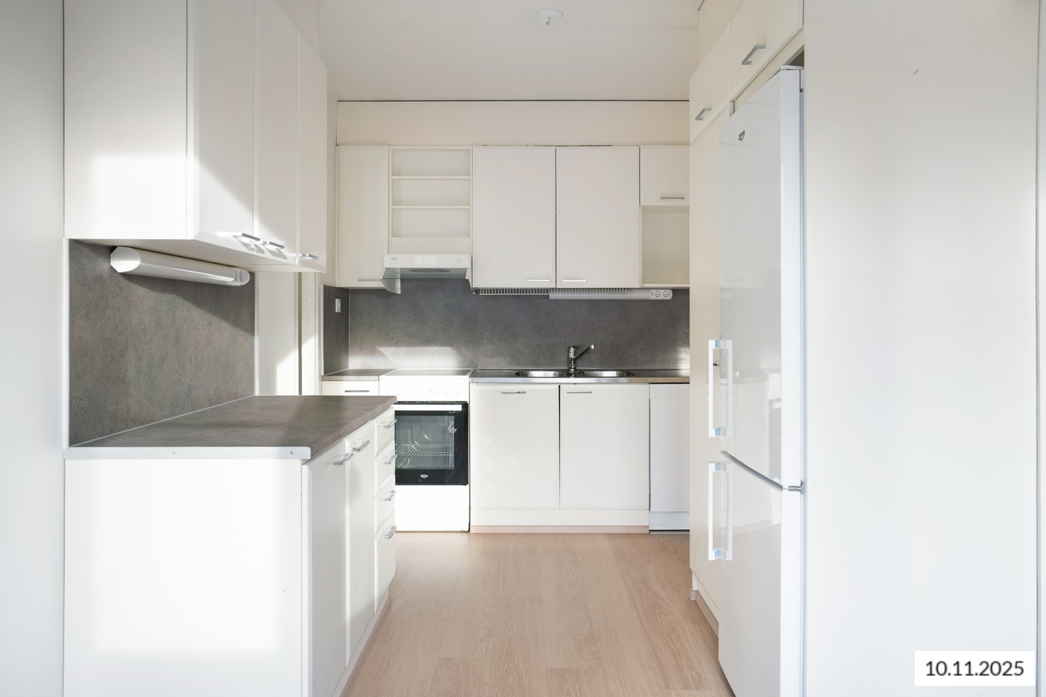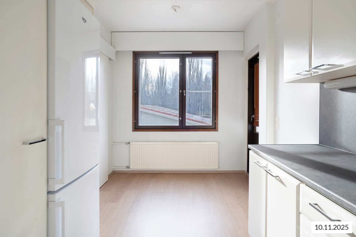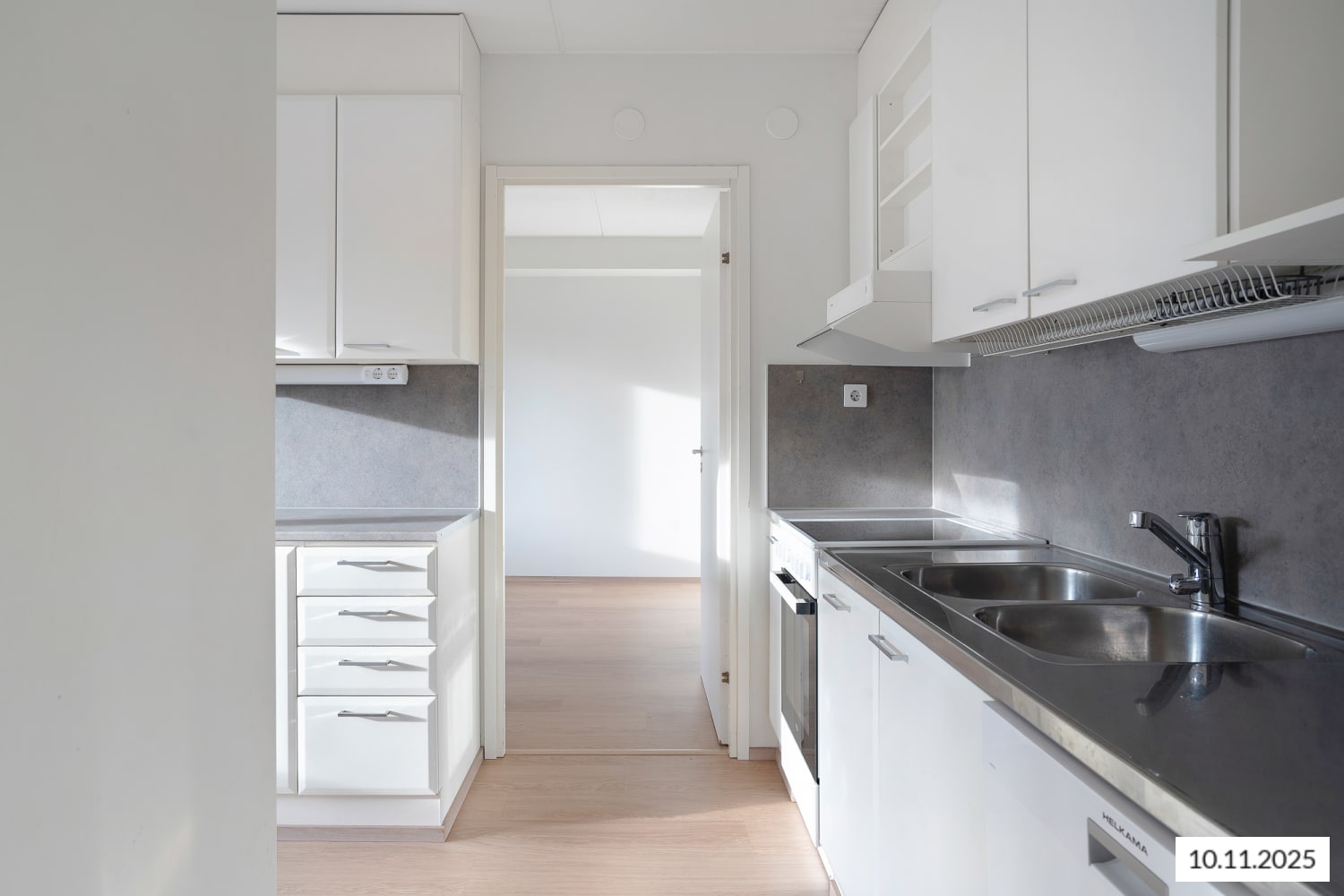 Keittiössä on keraaminen liesi, jääkaappi-pakastin ja tilaa ruokapöydälle ikkunan ääressä. Myös astianpesukoneellesi on paikka. Kylpyhuoneessa on pyykinpesukoneen tulo- ja poistoliitännät.