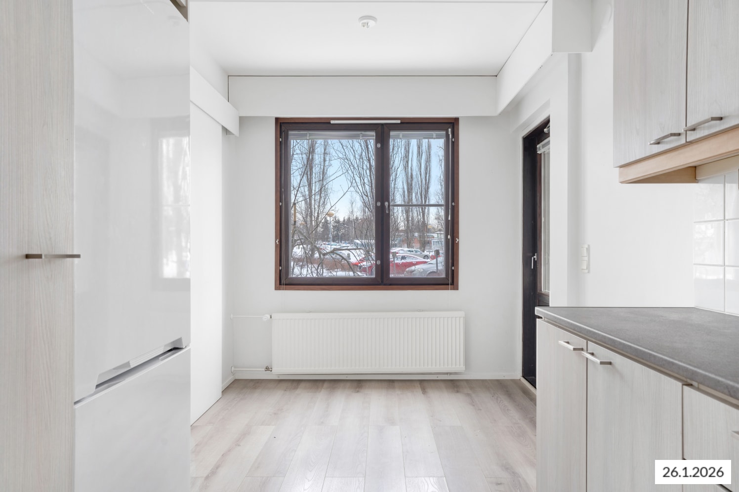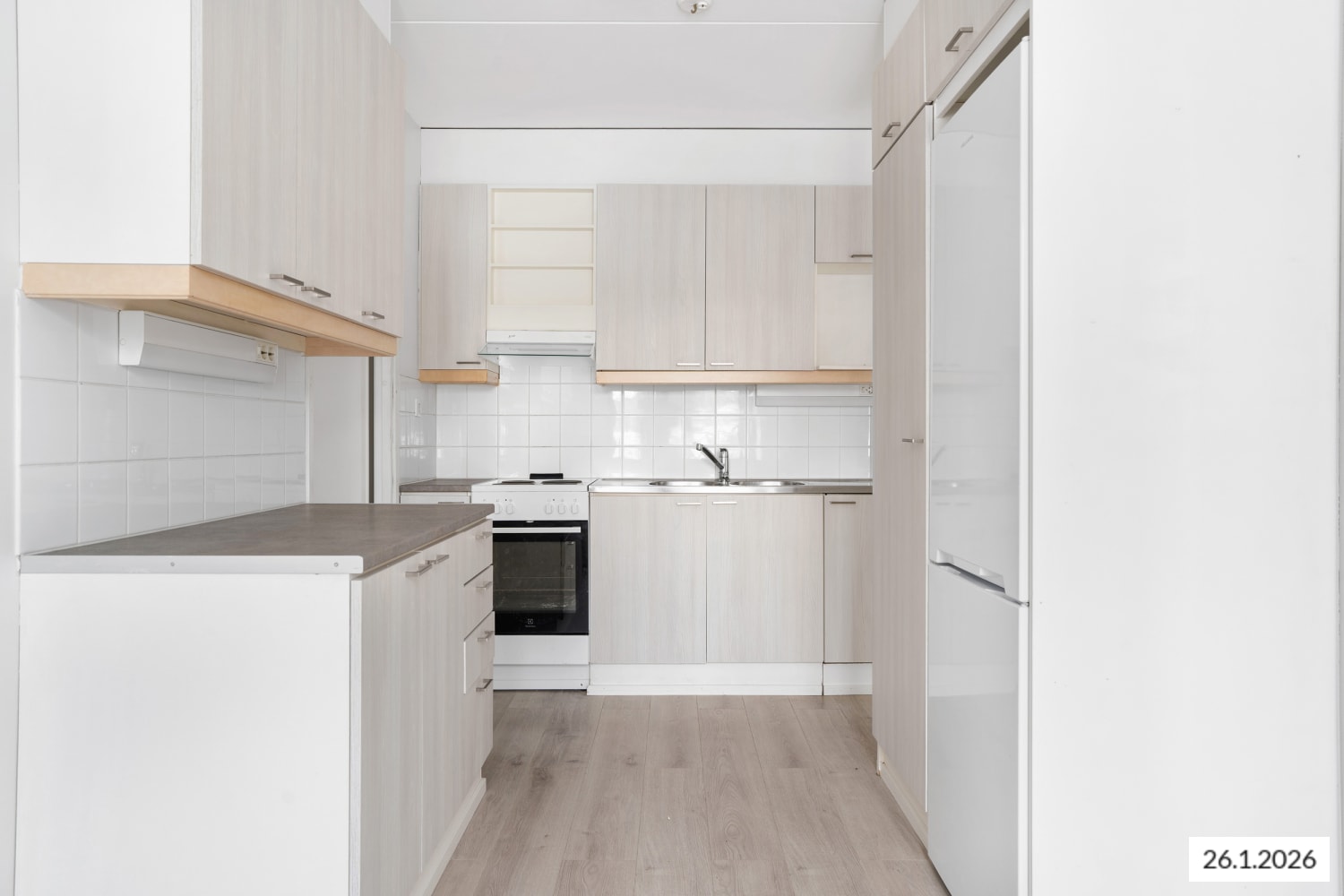 Keittiön kaapistot ovat harmaata puuta ja työtasot mustaa laminaattia. Keittiön seinät on kaakeloitu vaaleanharmaalla laatalla. Varustukseen kuuluu lattiauuni, perinteinen liesi ja jääkaappipakastin. Olisiko tässä uusi vuokrakotisi?