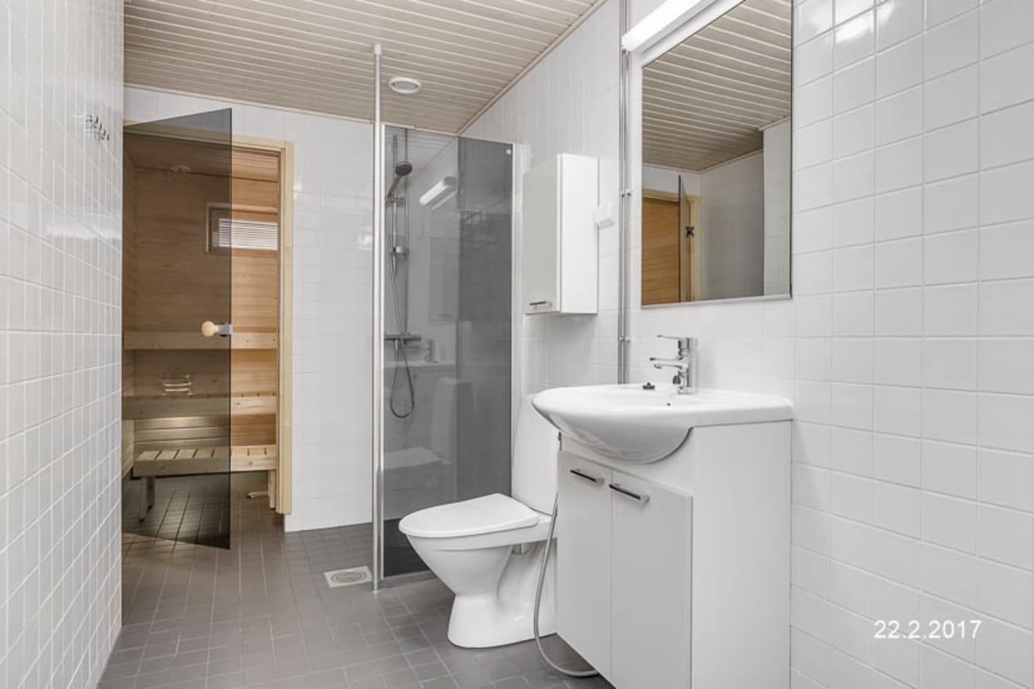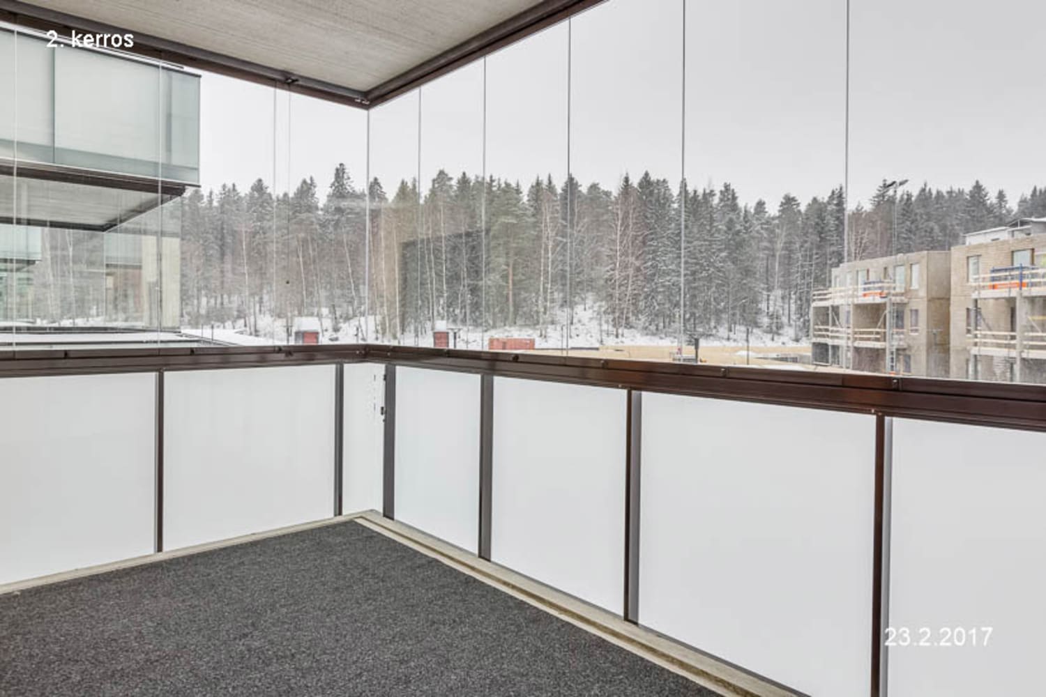Kauniin kolmion keittotila ja olohuone muodostavat selkeän, valoisan tilan, joka on helppo kalustaa oman maun mukaan. Olohuoneesta pääsee mukavana kesähuoneena toimivalle lasitetulle parvekkeelle. Oman saunan löylyissä kelpaa rentoutua päivän päätteeksi.