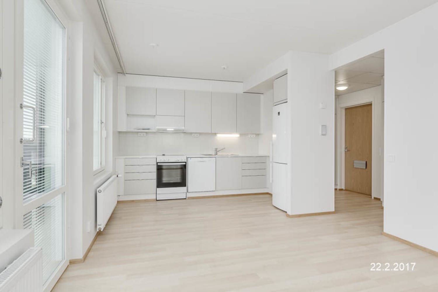 Asuintilojen lattiat ovat vaahteran sävyistä laminaattia. Valkoisia seiniä elävöittää hiekan sävyinen tehosteseinä. Keittiökaapistojen ovet ovat vaaleaa hiekan sävyä ja ylä- ja alakaappien välinen tila on laatoitettu vaaleilla laatoilla. Työtaso on valkoista laminaattia. Varustukseen kuuluu keraaminen liesi, astianpesukone ja jääkaappipakastin. Kylpyhuoneessa lattiat ovat hillityn harmaata ja seinät valkoista laattaa. Kalusteet ovat väriltään vaaleat. Pesukoneelle ja pyykinkuivaajalle on varaus. Asukasmäärään perustuva vesimaksu muuttuu 1.12.2024 alkaen vedenkulutukseen perustuvaan vesimaksuun.