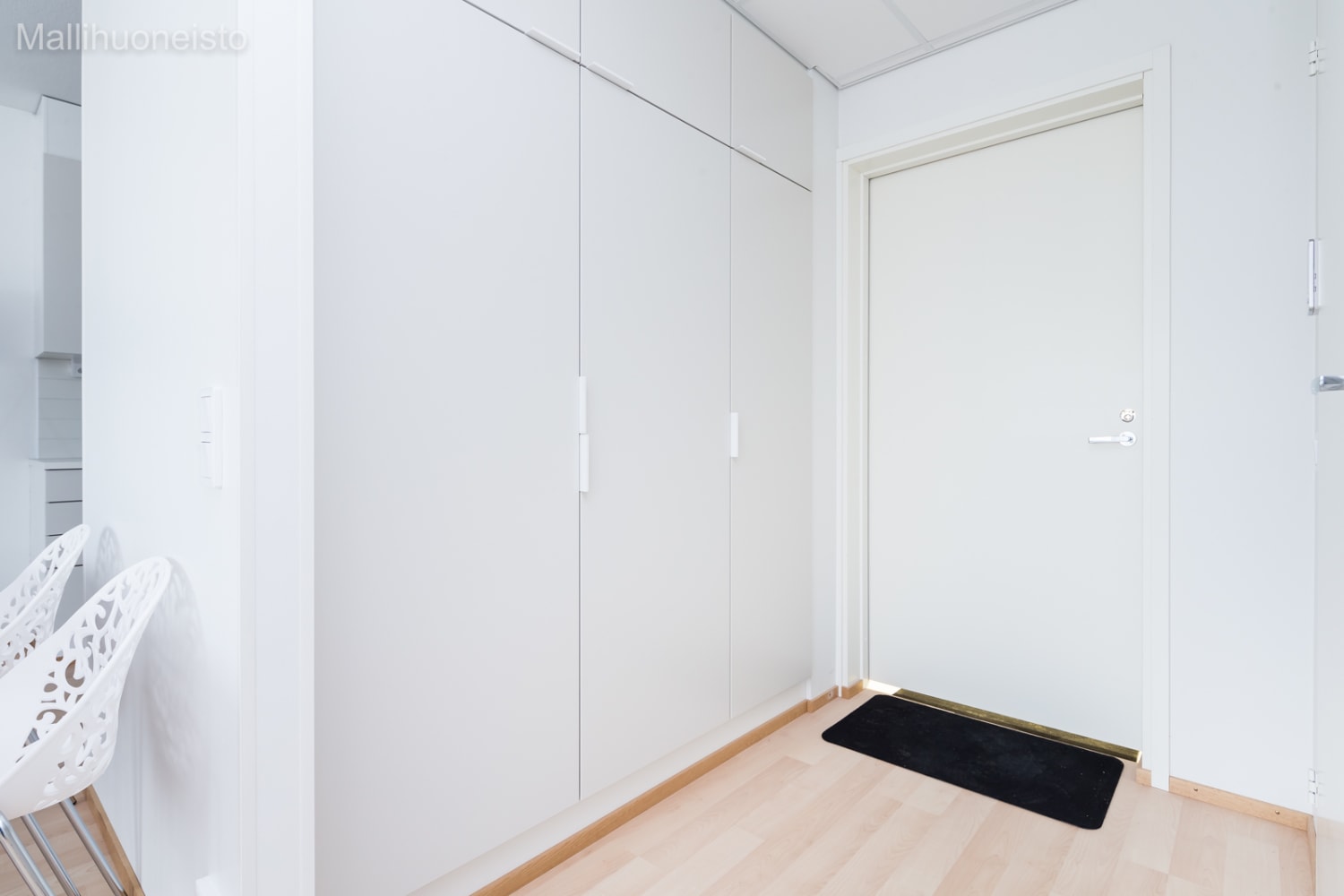 Asuintilojen lattiat ovat vaahteran sävyistä laminaattia. Valkoisia seiniä elävöittää hiekan sävyinen tehosteseinä. Keittiökaapistojen ovet ovat vaaleaa hiekan sävyä ja ylä- ja alakaappien välinen tila on laatoitettu vaaleilla laatoilla. Työtaso on valkoista laminaattia. Varustukseen kuuluu keraaminen liesi, astianpesukone ja jääkaappipakastin. Kylpyhuoneessa lattiat ovat hillityn harmaata ja seinät valkoista laattaa. Kalusteet ovat väriltään vaaleat. Pesukoneelle ja pyykinkuivaajalle on varaus.