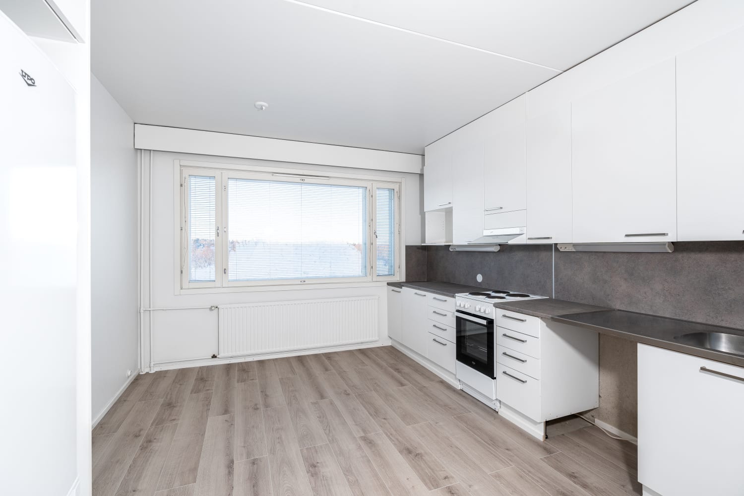 Keittiöön mahtuu mukavasti ruokapöytä ja varustukseen kuuluu jääkaappipakastin, lattiauuni sekä liesi. Astianpesukone on mahdollista asentaa.