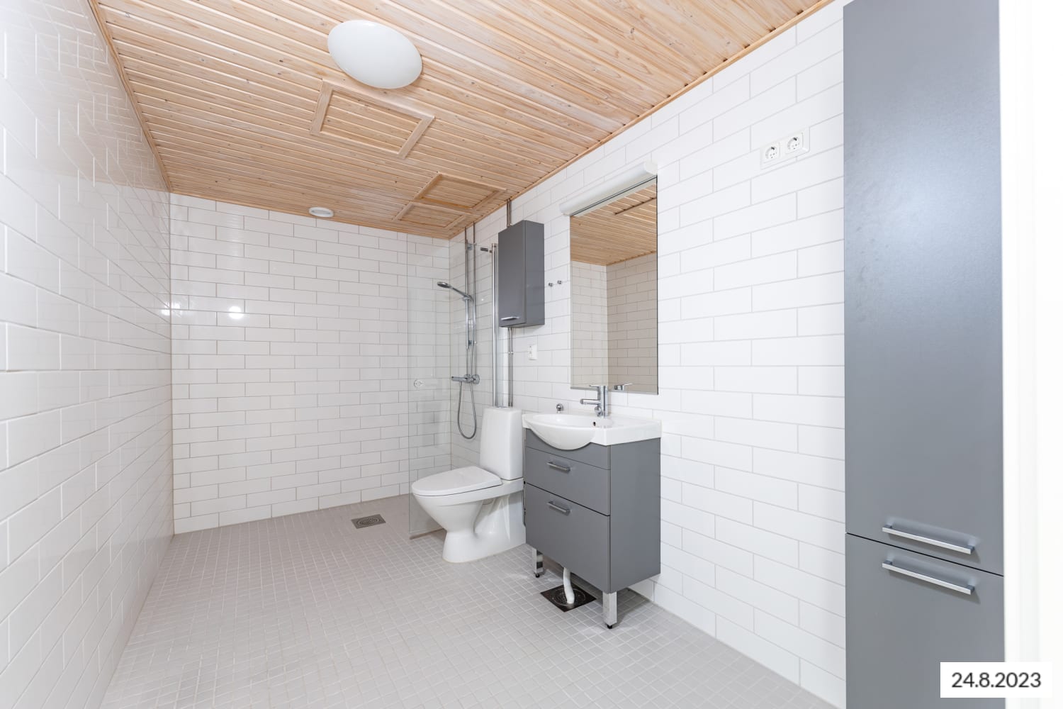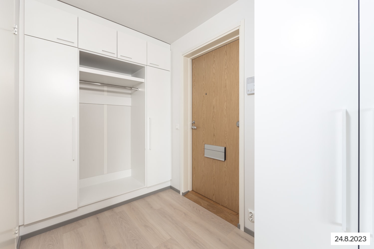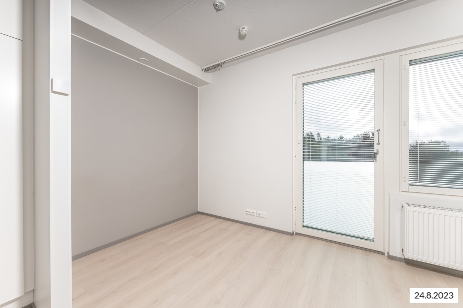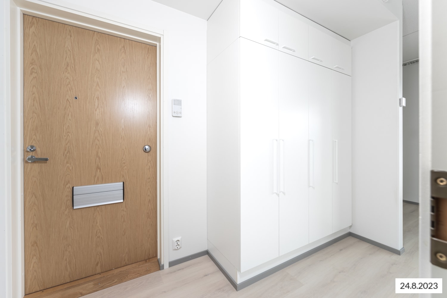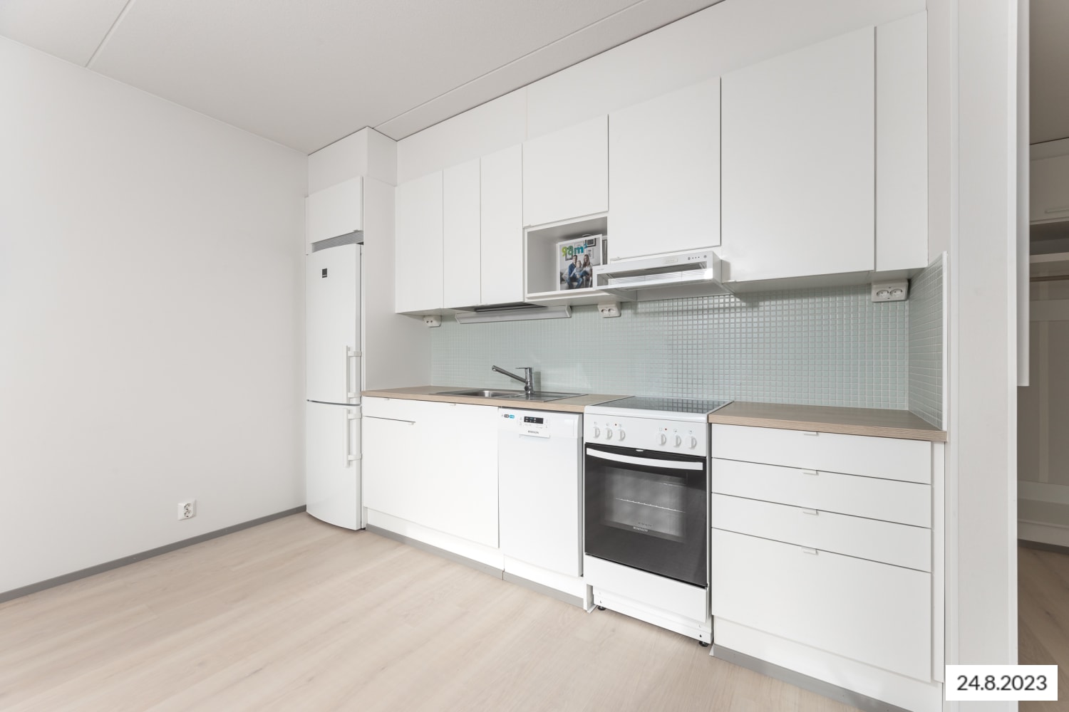 Asuintilojen lattiat ovat valkaistun tammen sävyistä laminaattia ja seinät ovat pääosin valkoisia. Hiekan sävyinen tehosteseinä pehmentää tunnelmaa alkovissa. Keittiökaapistot ovat raikkaan valkoiset. Ylä- ja alakaappien välinen tila on laatoitettu veden vihreillä laatoilla. Työtaso on lattiaan sointuvaa vaalean puun sävyistä laminaattia. Varustukseen kuuluu keraaminen liesi, astianpesukone ja jääkaappipakastin. Kylpyhuoneessa lattiat ovat vaalean harmaata ja seinät valkoista laattaa. Kalusteet ovat harmaat. Pesukoneelle ja pyykinkuivaajalle on varaus.