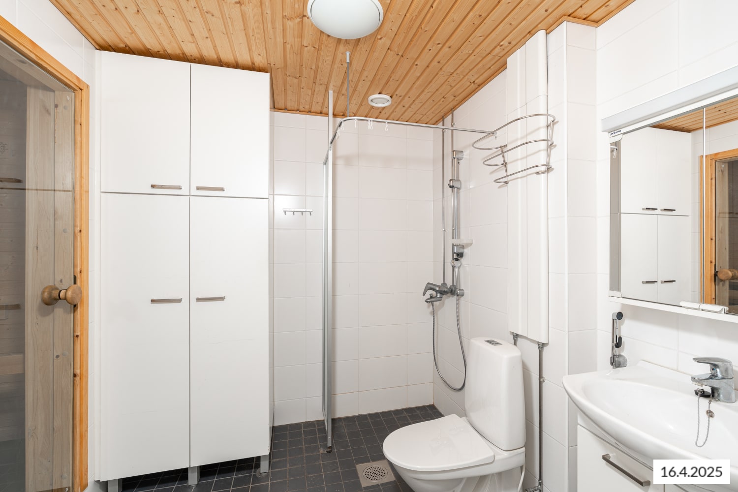 Asuinhuoneiden lattiamateriaalina on tyylikäs tammilautaparketti. Kylpyhuoneessa on tummanharmaa mukavuuslämmitetty laattalattia ja isot valkoiset vaakaan ladotut seinäkaakelit. Oma sauna tuo ripauksen luksusta arkeen.