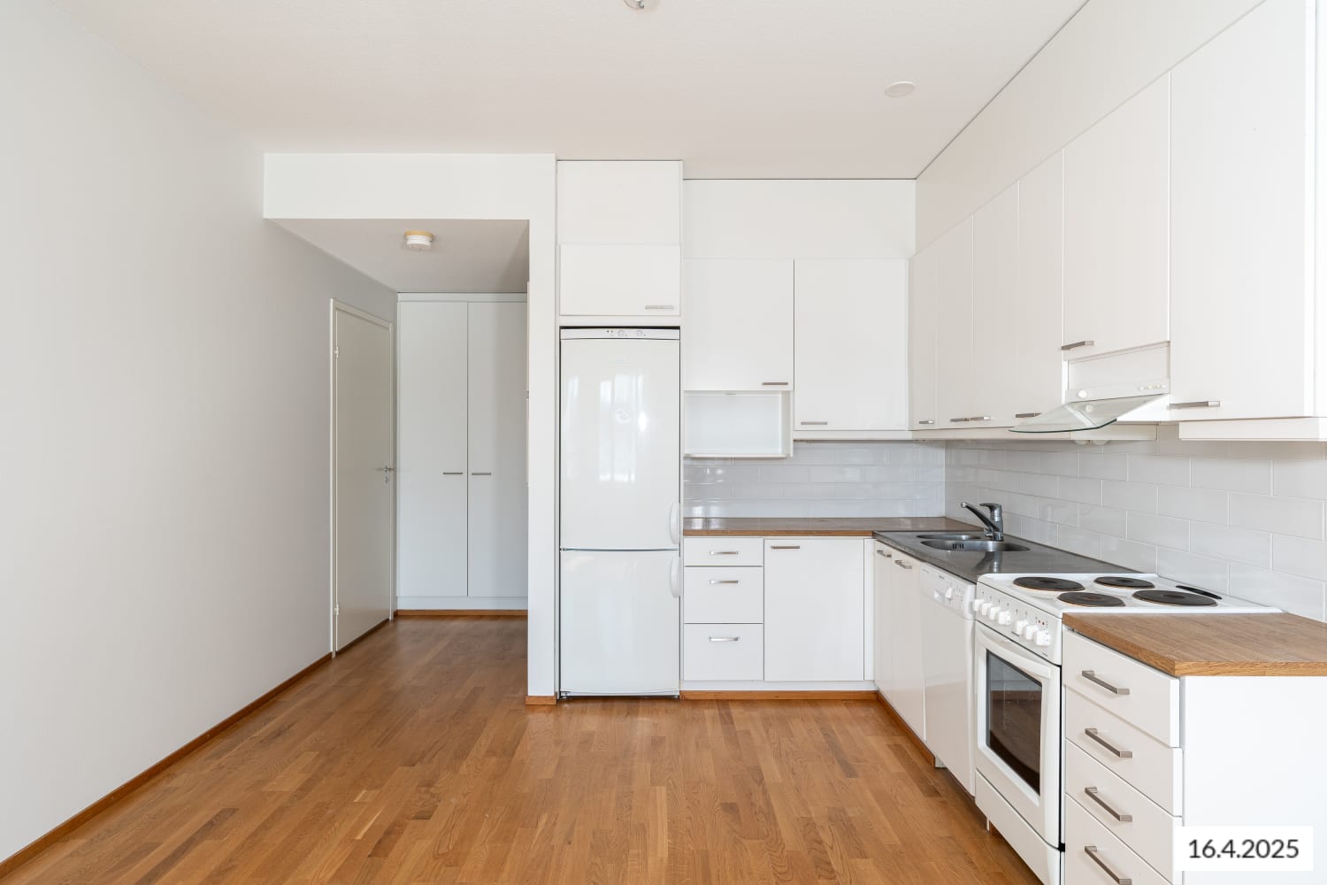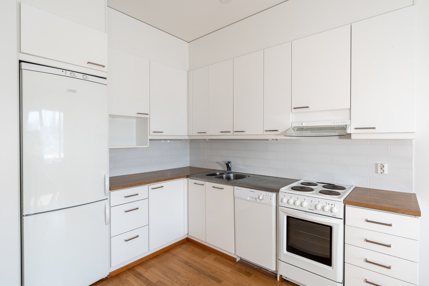 Keittokomerossa on valkoiset sileäoviset kaapistot, valkoinen välitilalaatoitus ja laminaattityötasot. Vakiovarustuksena on astianpesukone, sähköliesi sekä kaksi jää-pakastinkaappia. Kodinkoneet ovat valkoisia.