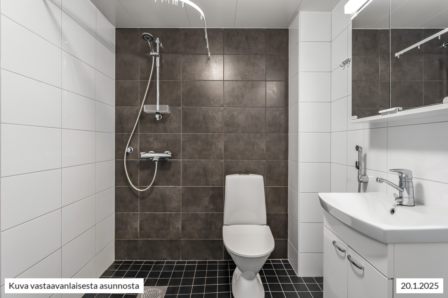Keittiössä on raikkaat valkoiset kaapistot ja astianpesukone helpottaa arkea. Kokonaan laatoitettu kylpyhuone on tyylikäs ja tilava.