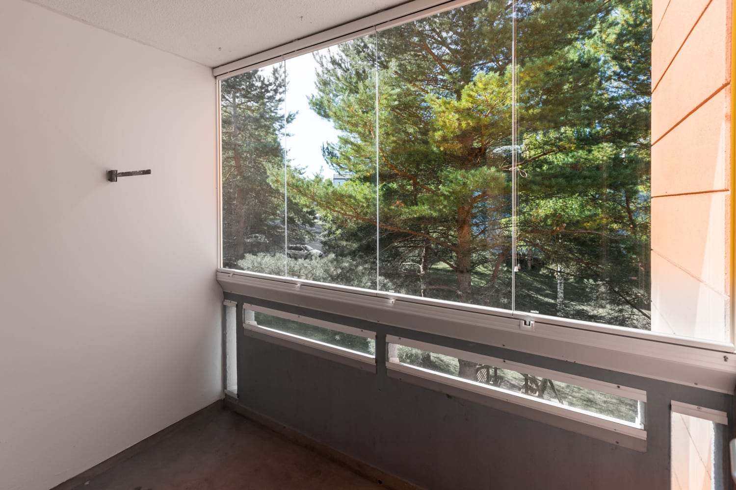 Valoisan läpitalon kaksion parvekkeelta avautuu näkymä, jonka äärellä on mukava nauttia vaikkapa aamukahvit.