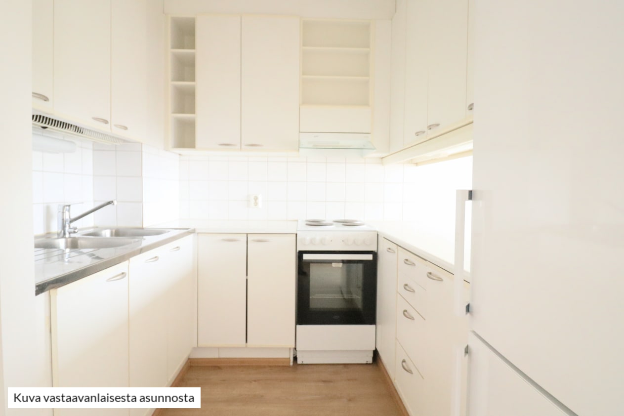 Vaaleasävyisessä keittiössä on valkoiset kalusteet ja jääkaappipakastin, liesi sekä liesikupu.