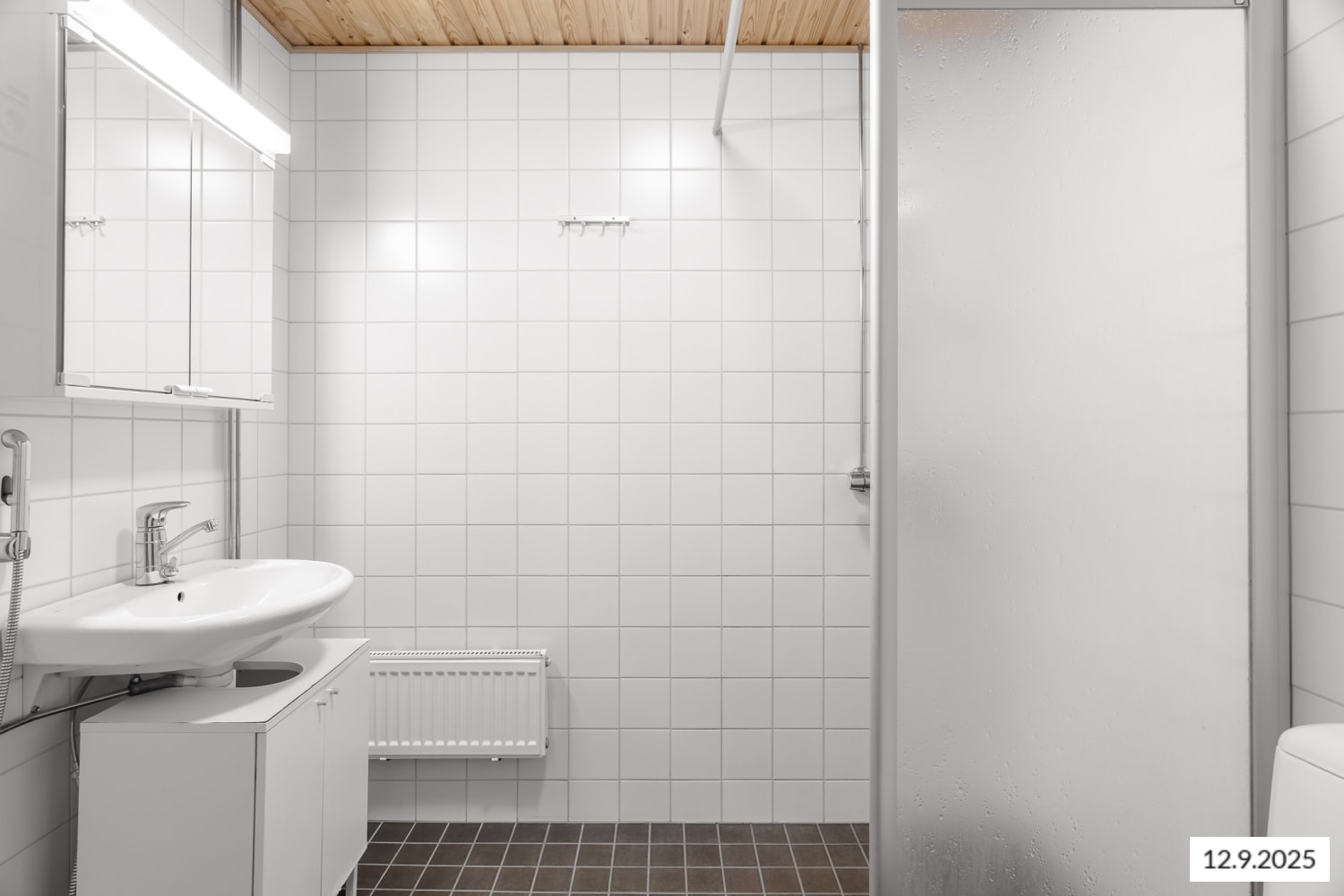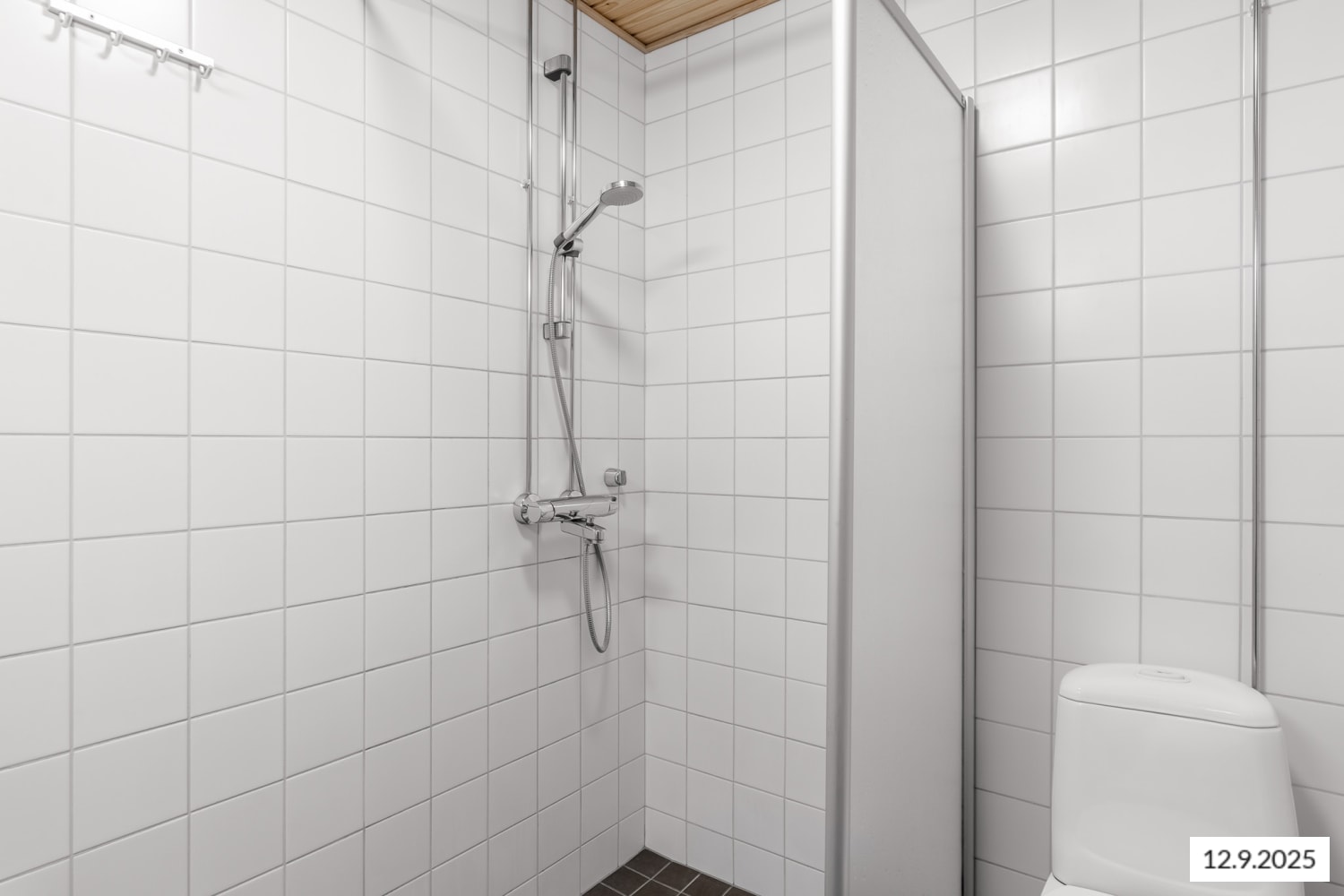 Keittiössä on vaaleat kalusteet, ja varustukseen kuuluu astianpesukone, jääkaappipakastin, perinteinen liesi ja liesituuletin. Kylpyhuone on laatoitettu ja siellä on tilaa pyykinpesukoneelle.
