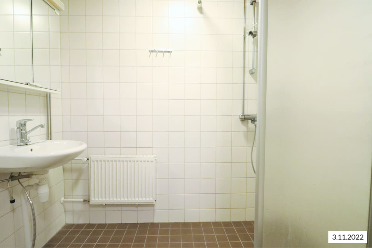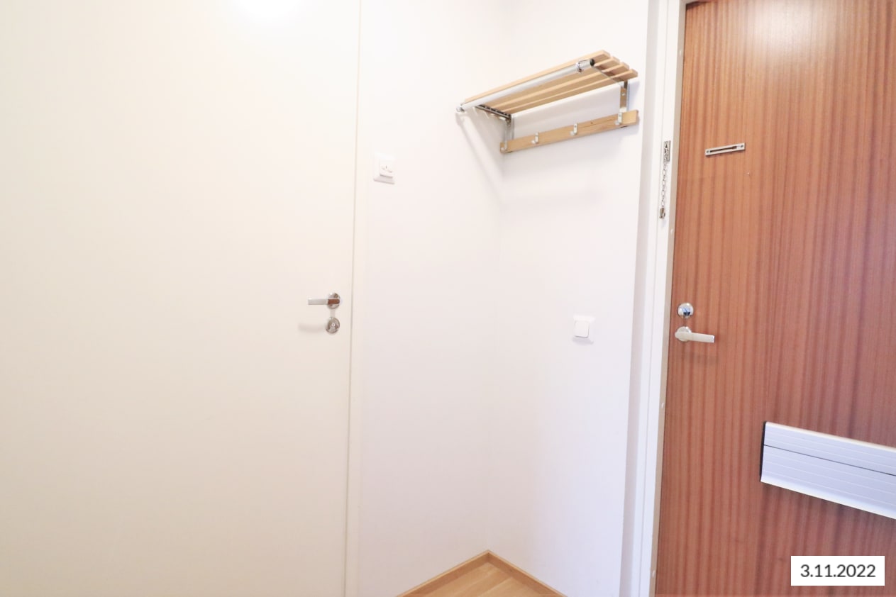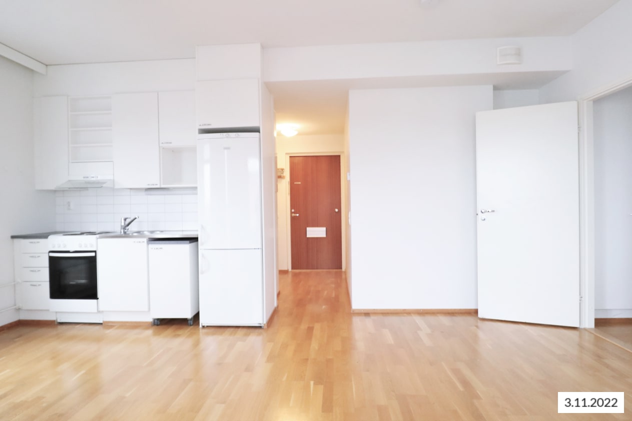 Valoisan kaksion lattiat ovat parkettia. Keittiössä on vaaleat kalusteet ja varusteena jääkaappipakastin, liesi, liesituuletin ja liitäntä astianpesukoneelle. Kylpyhuone on laatoitettu ja siellä on tilaa pyykinpesukoneelle. Maisemia voi ihailla omalta, lasitetulta parvekkeelta.