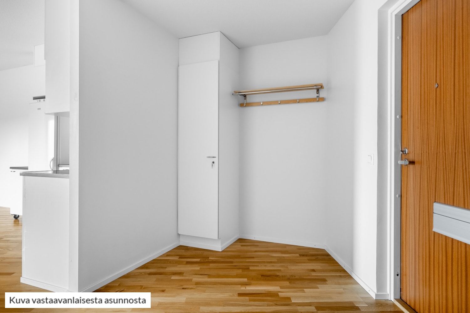 Lattiat ovat parkettia. Keittiössä on vaaleat kalusteet ja varusteena jääkaappipakastin, liesi, liesituuletin ja liitäntä astianpesukoneelle. Kylpyhuone on laatoitettu ja siellä on tilaa pyykinpesukoneelle. Maisemia voi ihailla ranskalaiselta parvekkeelta.