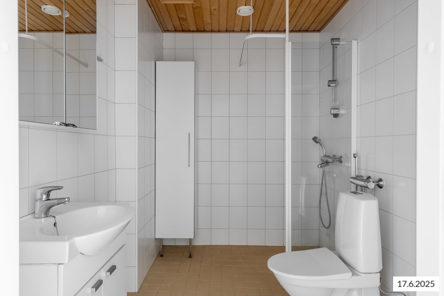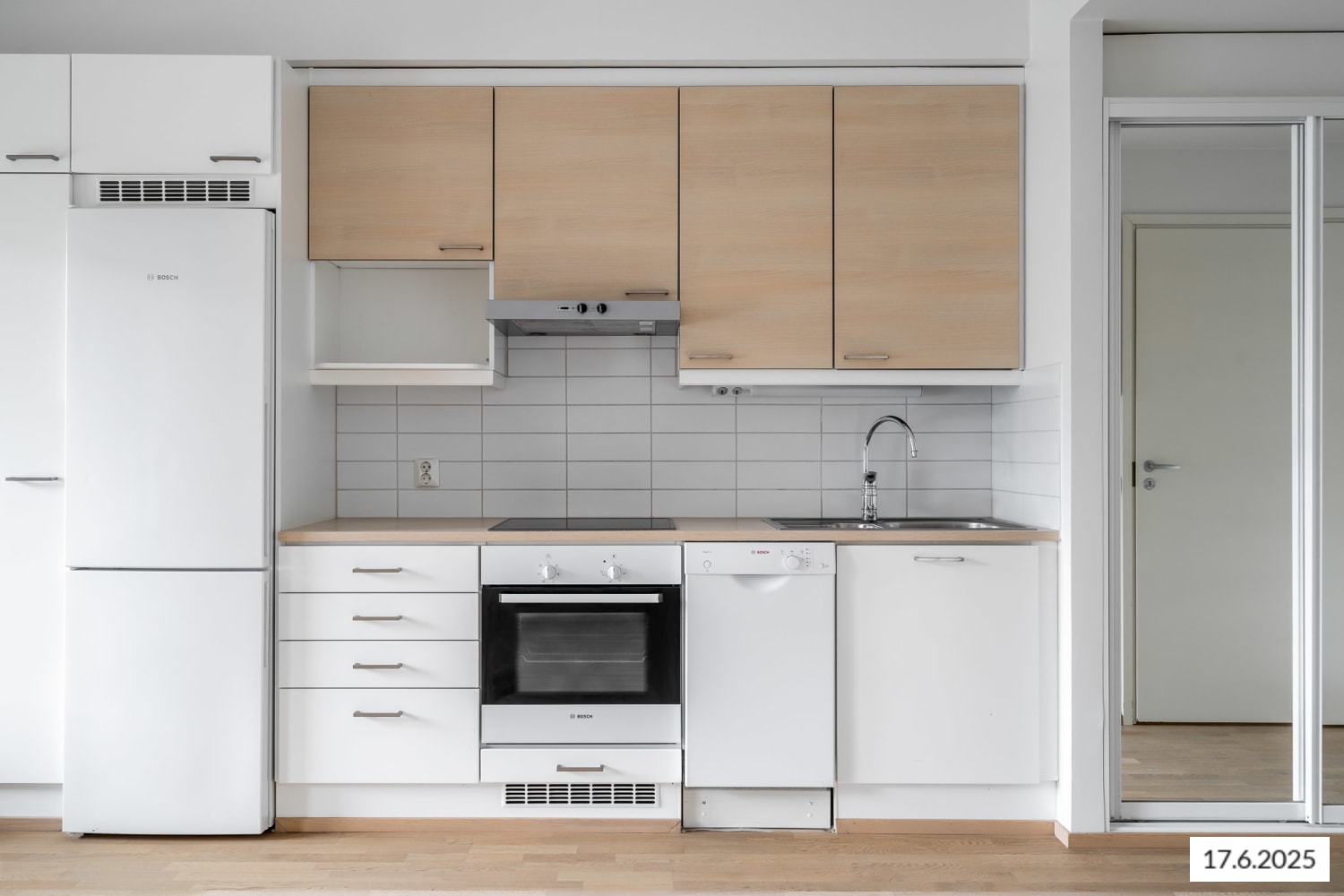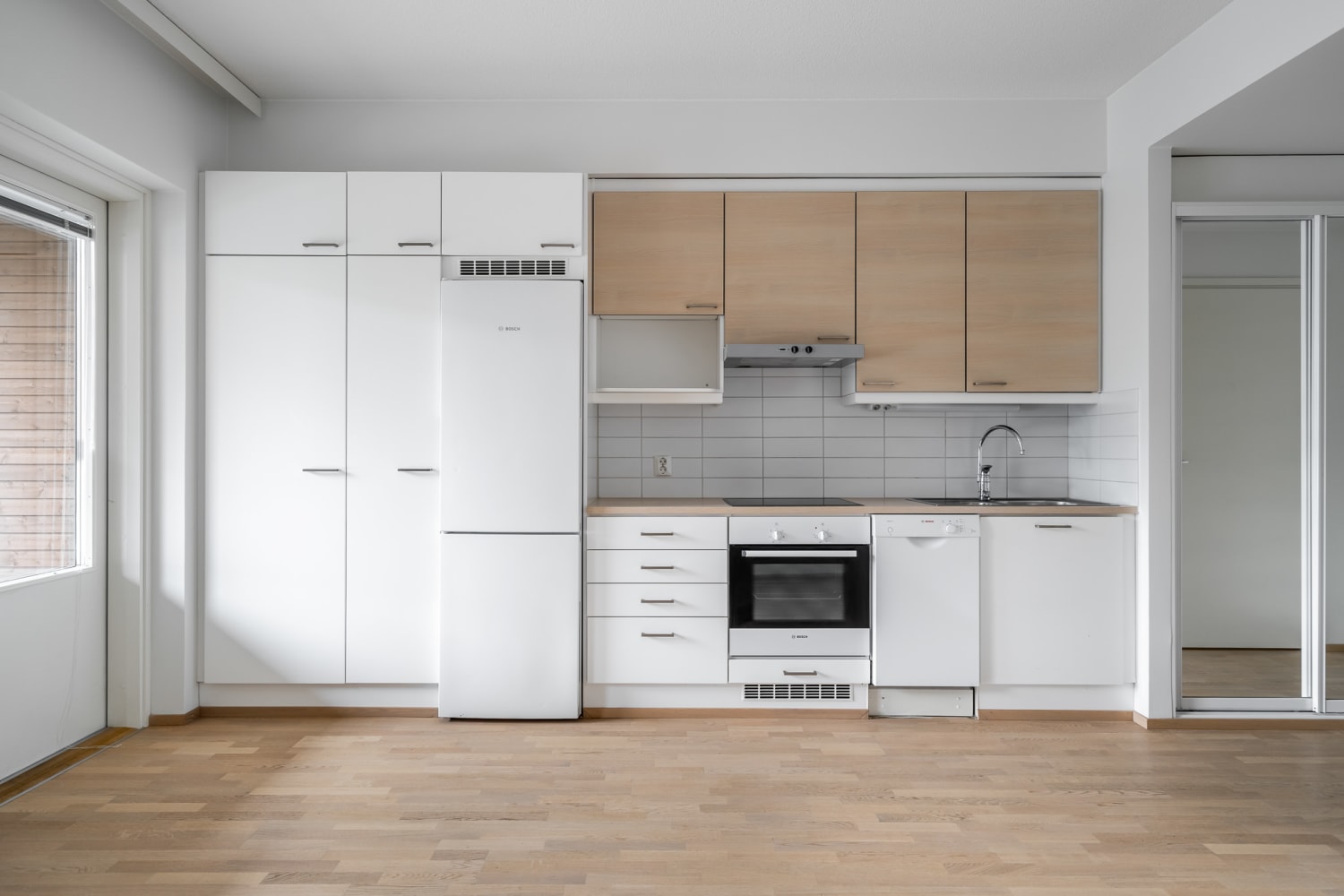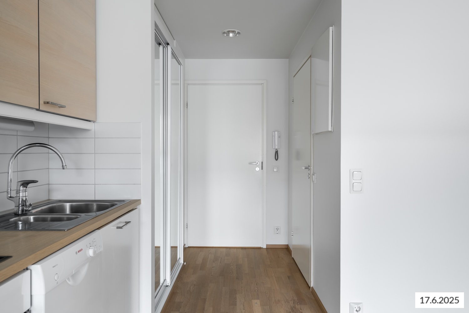 Asuinhuoneiden lattiat ovat valkomattalakattua tammiparkettia. Kylpyhuoneessa on lattialämmitys, himmeän beiget lattialaatat ja seinissä hennon viivakuvioista valkoista kaakelia. Keittokomeron yläkaapistoissa on kauniin vaalea tammikuvio, jonka sävyjä toistuu myös laminaattityötasossa. Alakaapit ovat valkoiset. Vakiovarustukseen kuuluvat jää-pakastinkaappi ja astianpesukone sekä keraaminen liesitaso kalusteuuneineen.