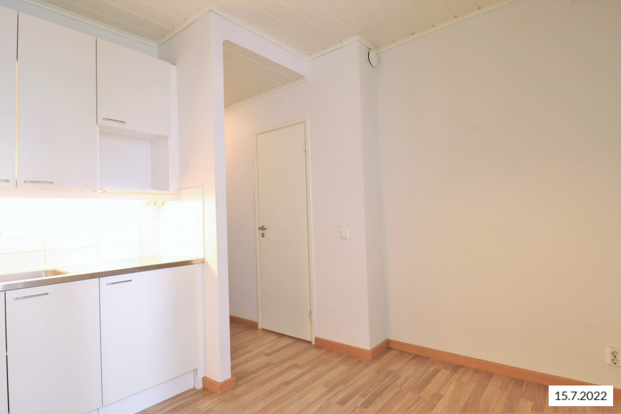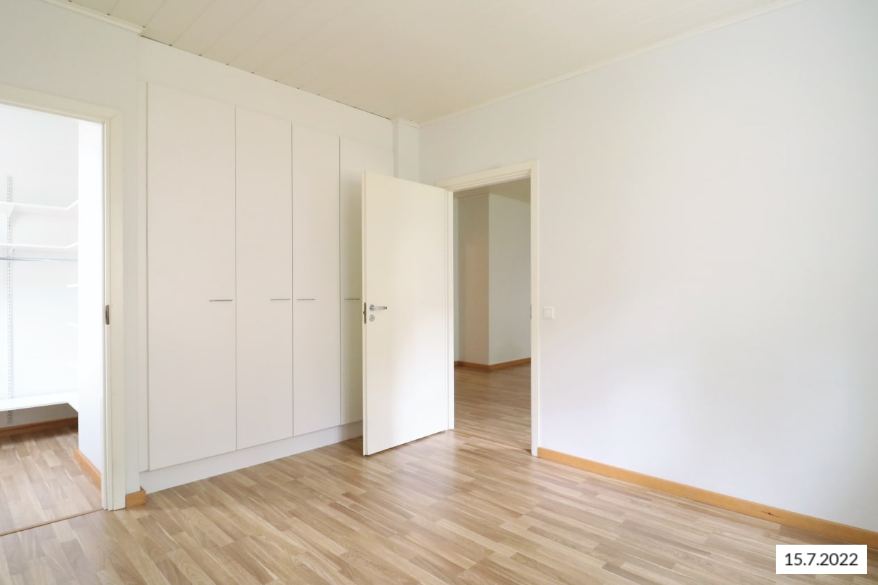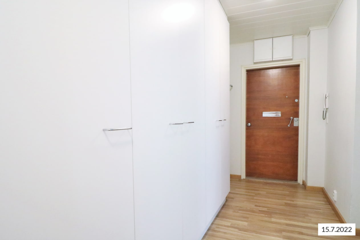 Tässä ihastuttavassa kaksiossa on toimiva pohjaratkaisu sekä valoisat puitteet. Seinät on maalattu valkoisiksi, tehden neutraalin pohjan mille tahansa sisustustyylille. Säilytystilaa on mukavasti makuuhuoneen korkeissa kaapeissa ja erillisessä vaatehuoneessa. Raikkaan valkoisen keittiön varustukseen kuuluu astianpesukone, jääkaappipakastin, lattiauuni sekä perinteinen liesi.