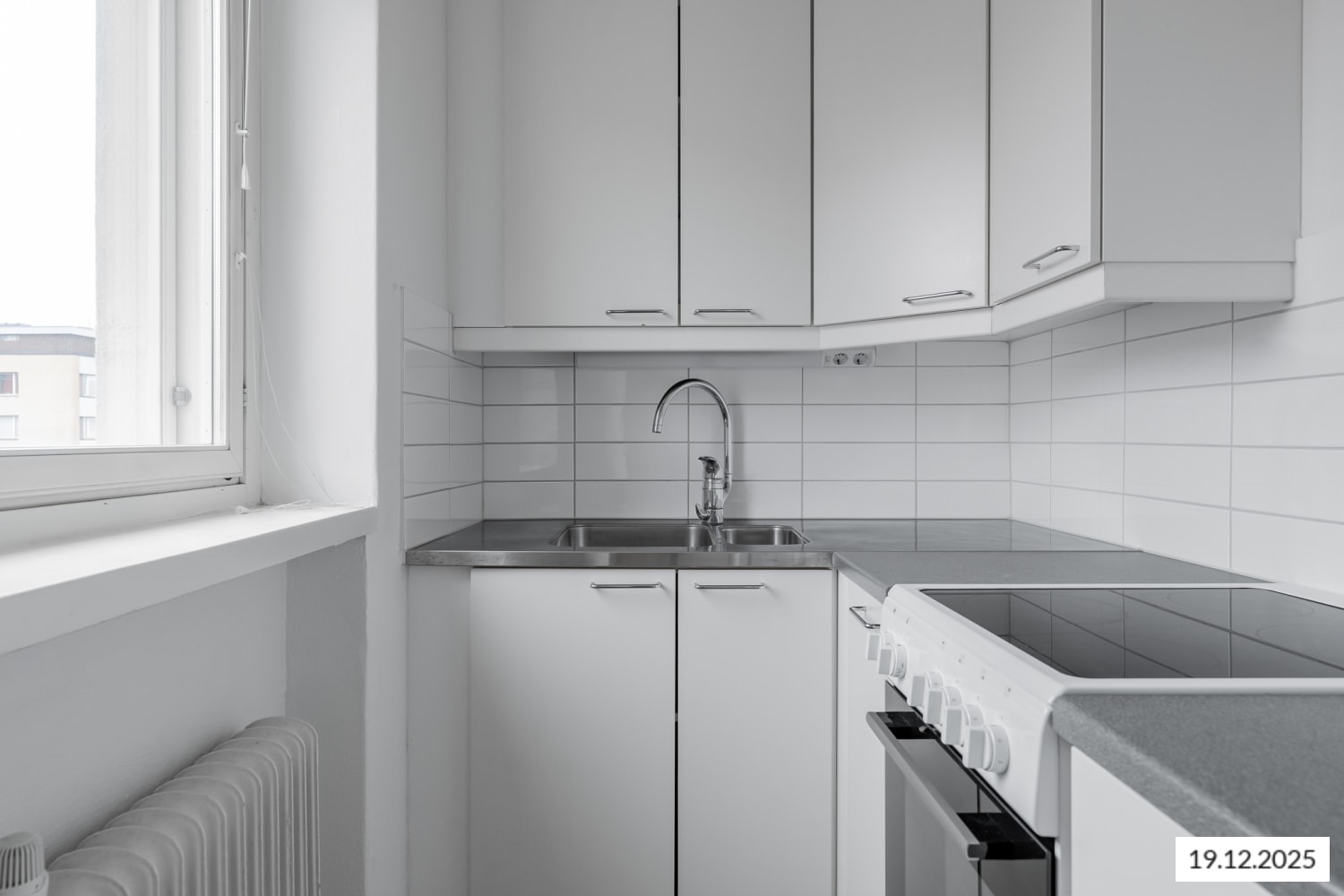 Keittiötilassa on perinteinen liesi ja jääkaappi, ja ikkunoissa valmiina sälekaihtimet. Kylpyhuoneen seinät on kauttaaltaan kaakeloitu, ja siellä on liitännät pesukoneelle.