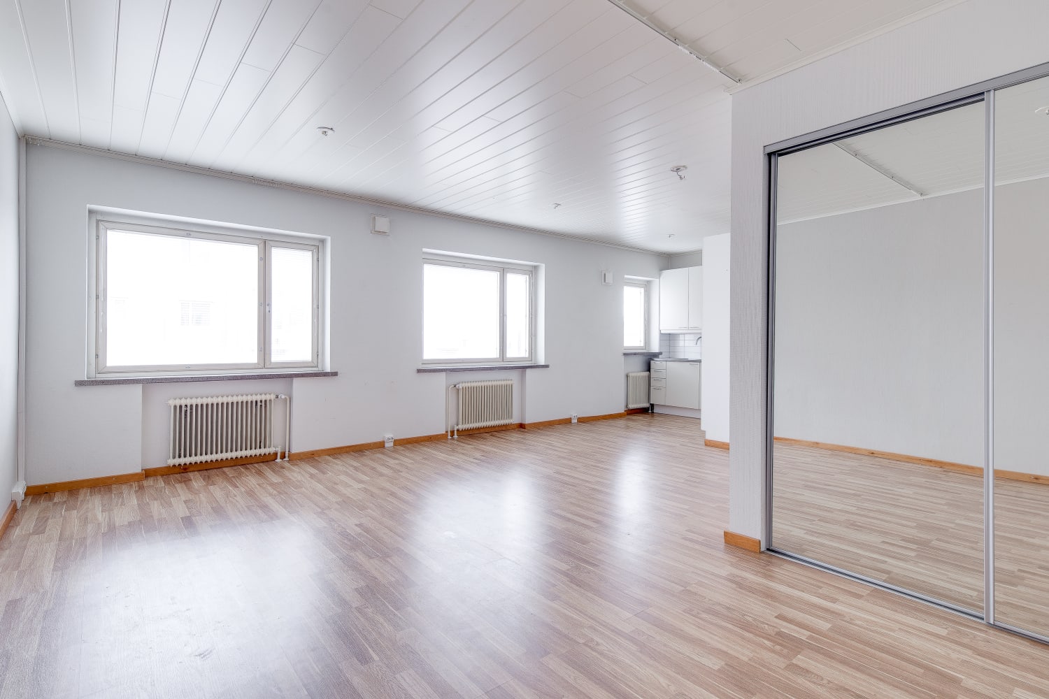 Peruskorjauksesta valmistuneen kodin lattiat ovat tammilaminaattia ja kylpyhuone kaakeloitu. Kylpyhuoneessa on myös paikka pyykkikoneelle.