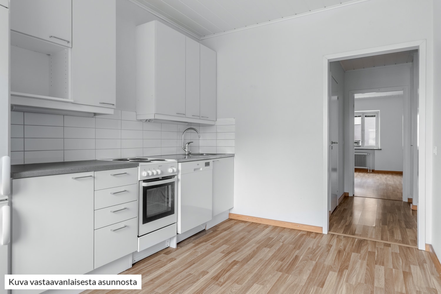 Peruskorjatun asunnon pinnat on uusittu ja lattiat ovat tammilaminaattia. Keittiössä on tilaa astianpesukoneellesi, ja keraaminen liesi on helppo pitää puhtaana.