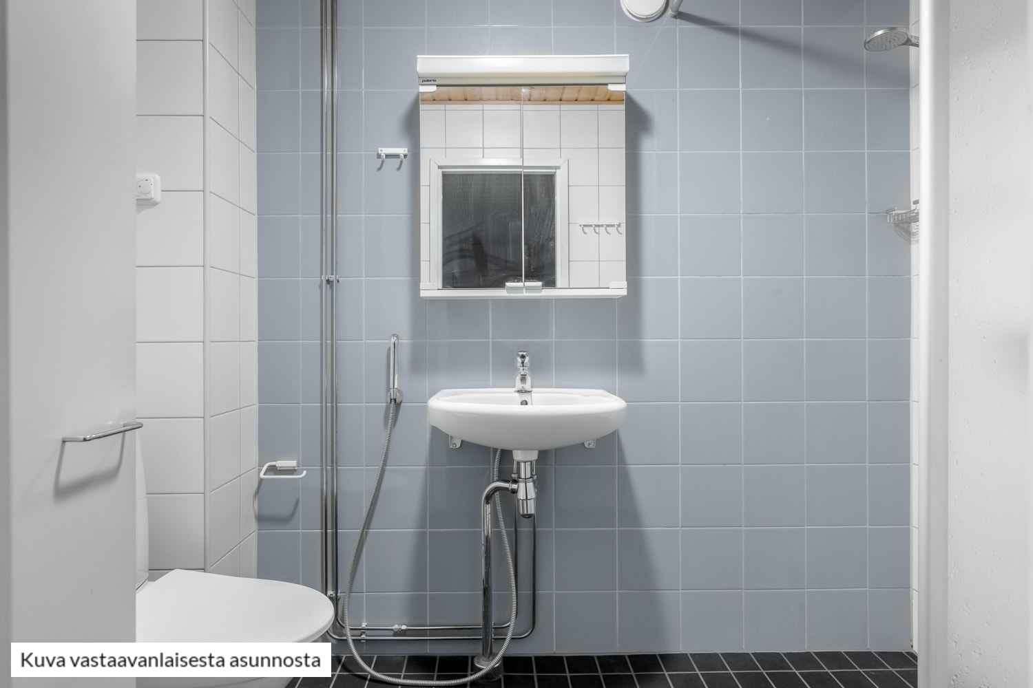 Moderni ja siisti kylpyhuone on kokonaan kaakeloitu.