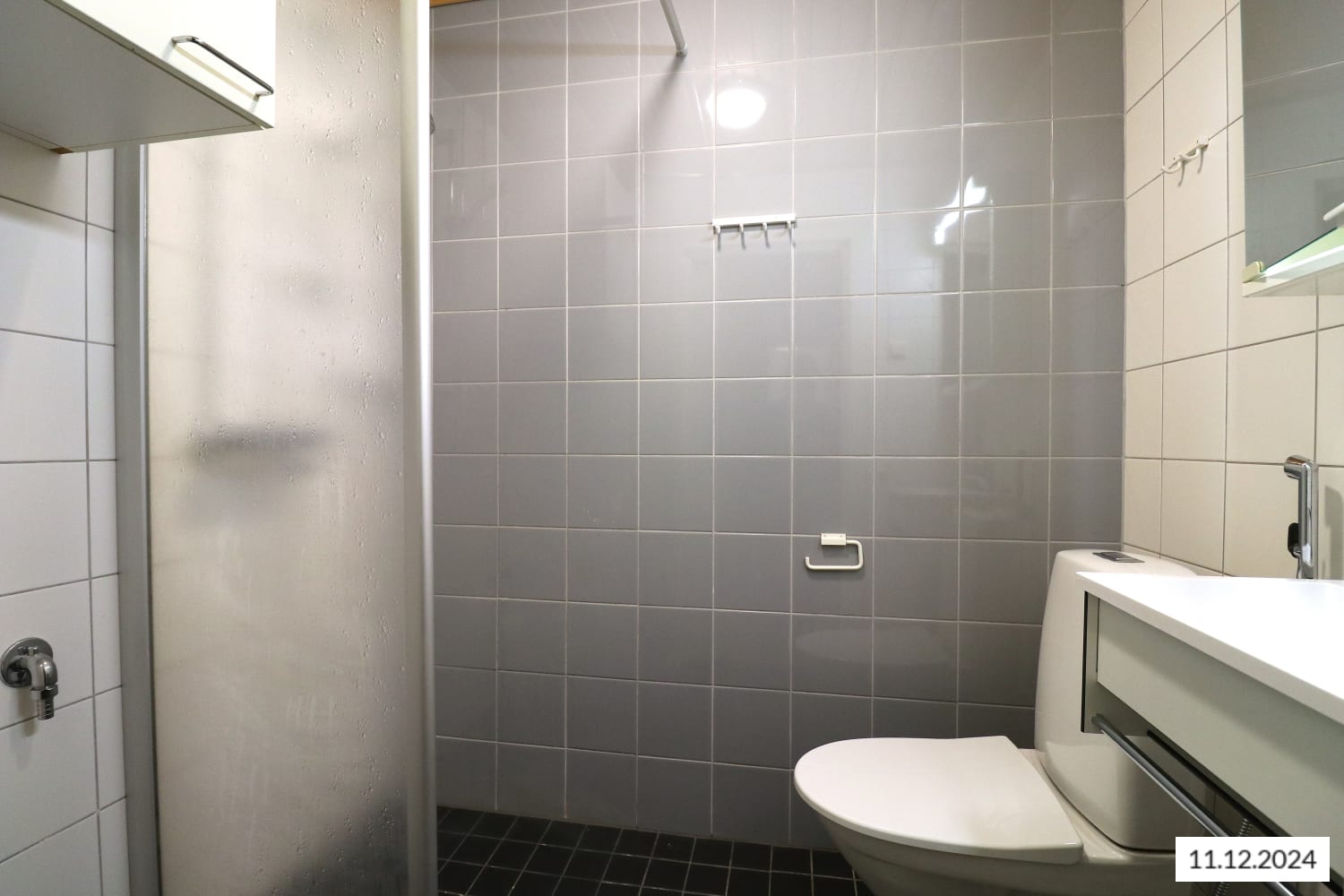 Keittiötila on käytännöllinen ja kompaktissa keittiössä on kaikki tarpeellinen arjen pyörittämiseen. Kylpyhuoneen kalusto on kotimaista Kide-mallistoa ja pesukoneelle löytyy liitännät.