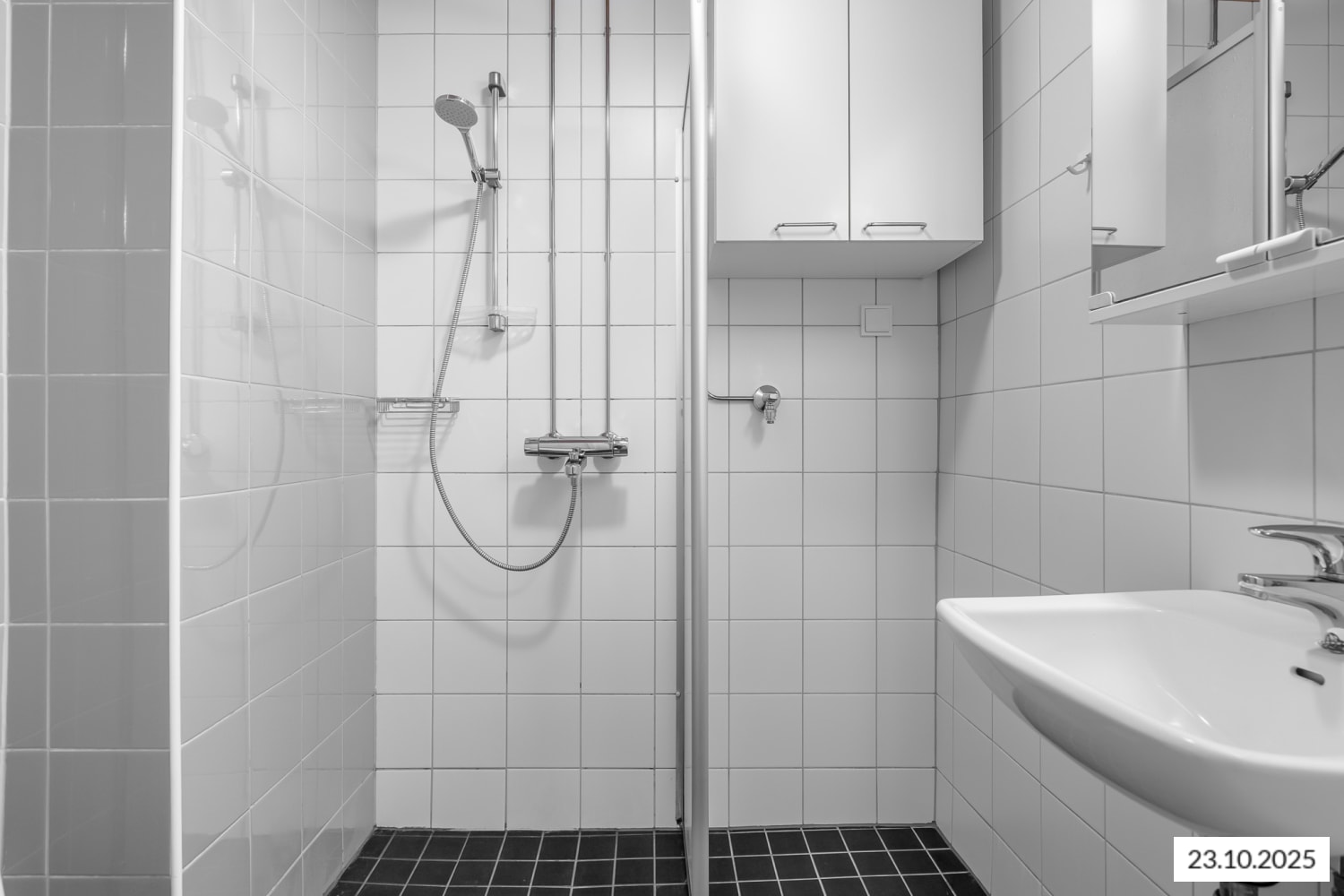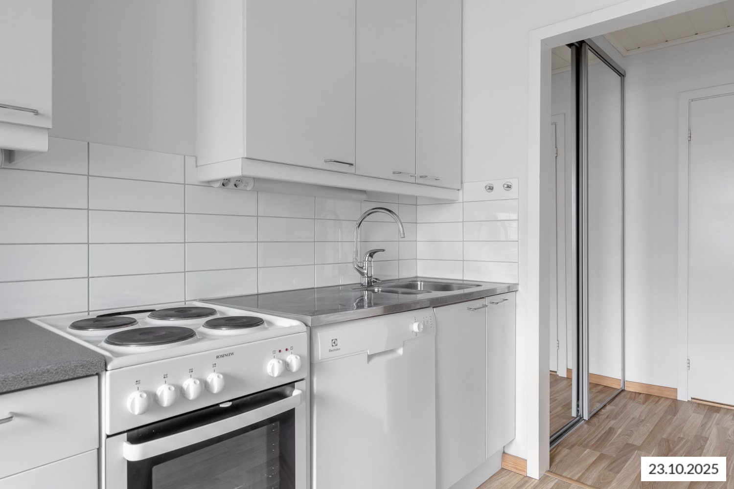 Keittiössä on astianpesukone, ja asunnon sälekaihtimet tuovat mukavasti yksityisyyttä. Kylpyhuone on kaakeloitu, ja siellä on liitännät pyykinpesukoneelle.