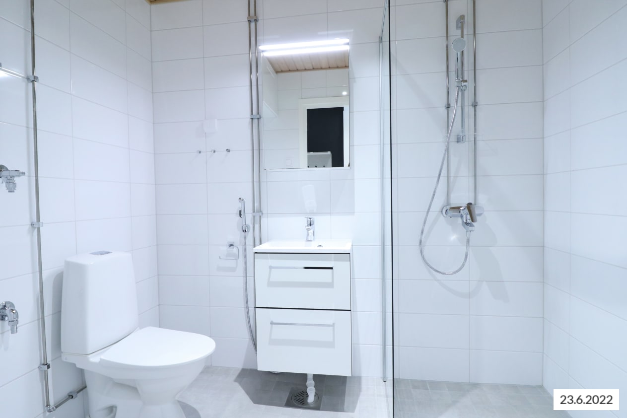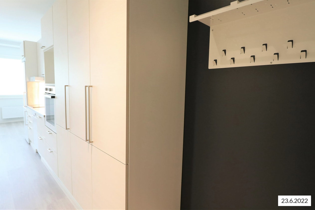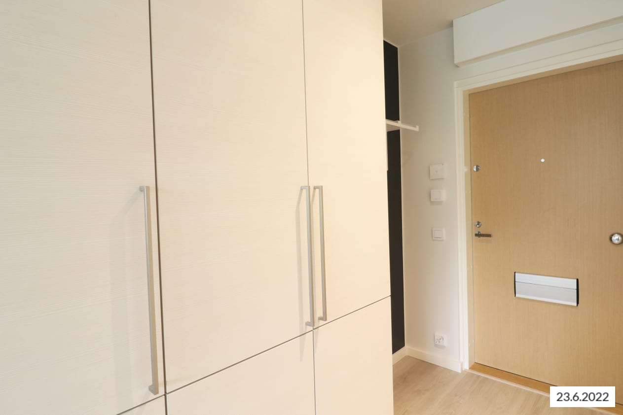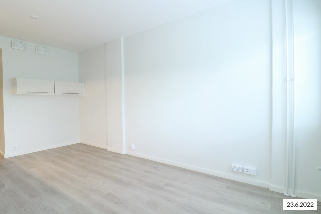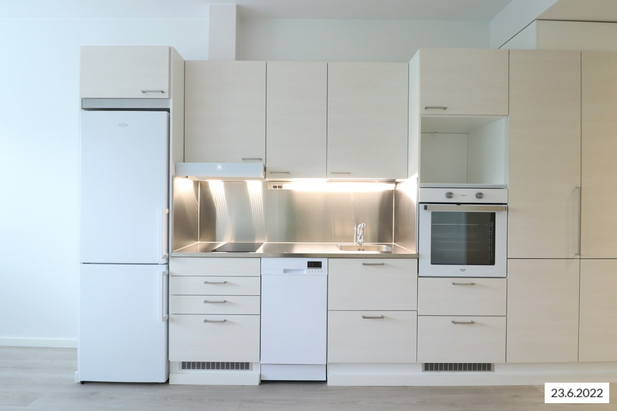 1990-luvun toimistotalon kolmanteen kerrokseen kesällä 2022 valmistunut yksiö on selkeä ja ajattoman kaunis. Yksiön keittiö ja olohuone muodostavat toimivan ja nykyaikaisen kokonaisuuden, jonka sisustat helposti mieluisaksi. Asunnon päätyseinän levyinen ikkuna antaa valoa ja saa tilan tuntumaan neliöitään suuremmalta.