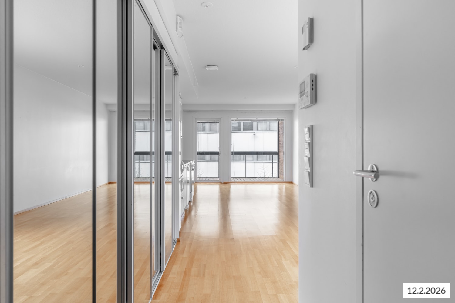 Tasokas kaupunkikaksio ihastuttaa vaaleilla pinnoillaan ja hyvällä varustetasollaan. Pitkän mallinen pohjaratkaisu jäsentyy helposti makuualkoviksi ja olohuoneeksi vaikkapa sermin tai kirjahyllyn avulla, ja kodissa on hyvin tilaa niin ruokailu- kuin sohvaryhmällekin. Lasikaiteinen lasitettu parveke antaa Lenkkipolun puolelle luoteeseen.