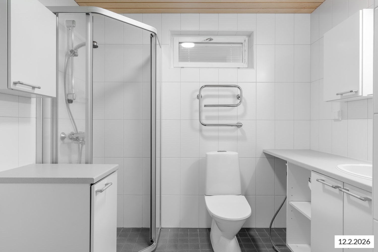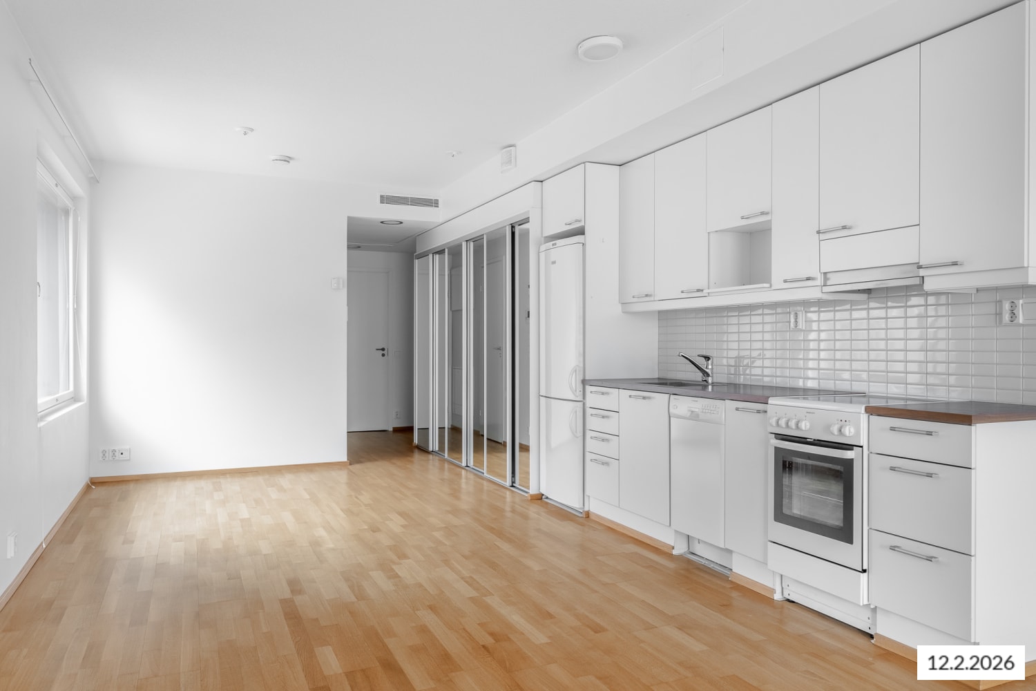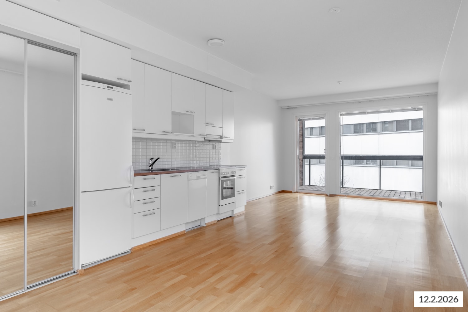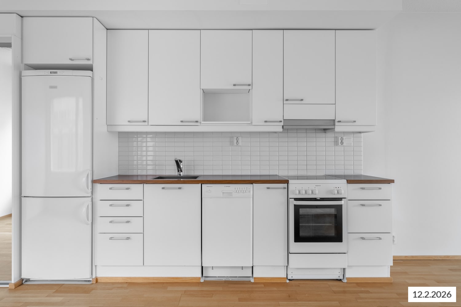 Asuinhuoneen parkettilattiat ovat jalan alla ihanan lämpimät vesikiertoisen lattialämmityksen ansiosta. Kylpyhuone on kaakeloitu. Keittiökaapistot ovat valkoiset ja työtasot pähkinäpuuta mukailevaa laminaattia. Asunnon vakiovarustukseen kuuluvat astianpesukone, jää-pakastinkaappi, keraaminen liesi sekä mikroaaltouuni.