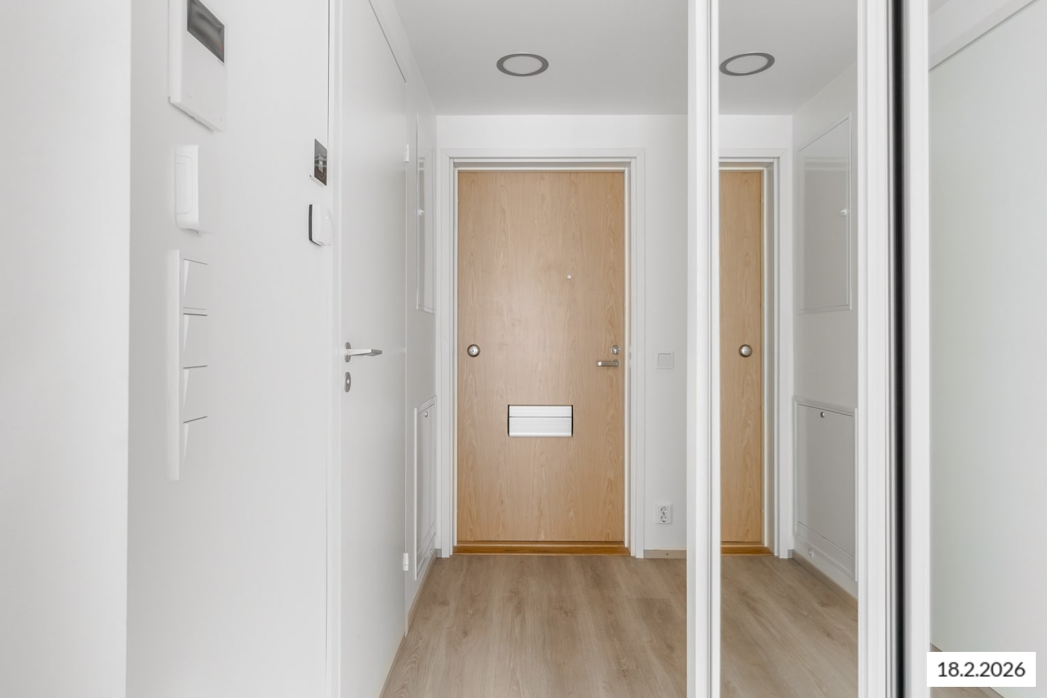 Asuintilojen lattiat ovat valkaistun tammen sävyistä laminaattia. Valkoiseksi maalattuja seinäpintoja elävöittää hillityn harmaa tehosteseinä. Keittiössä kaapistojen ovet ovat valkoiset ja vetimet ovat harjattua kromia. Ylä- ja alakaappien välinen tila on laatoitettu kiiltävän valkoisilla laatoilla. Työtaso on betonin harmaata laminaattia. Varustukseen kuuluu keraaminen liesi, astianpesukone ja jääkaappipakastin.