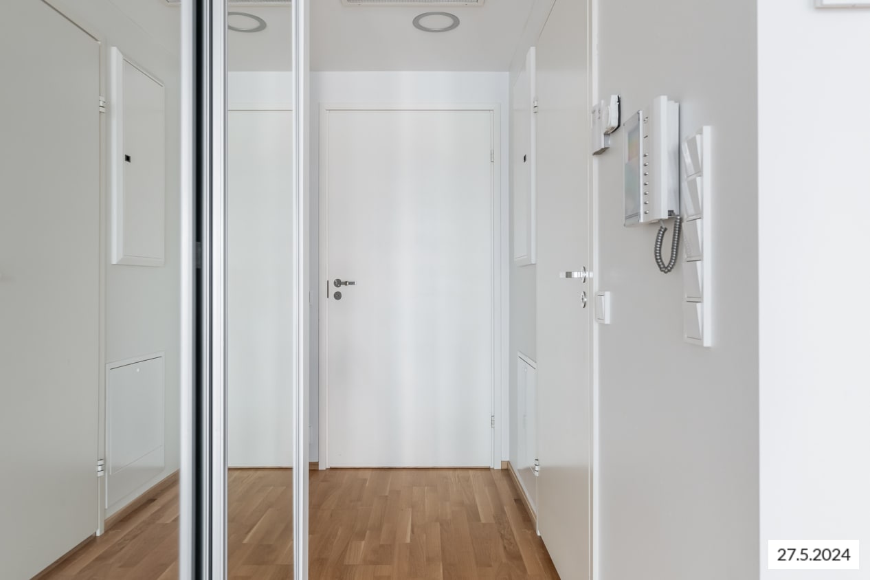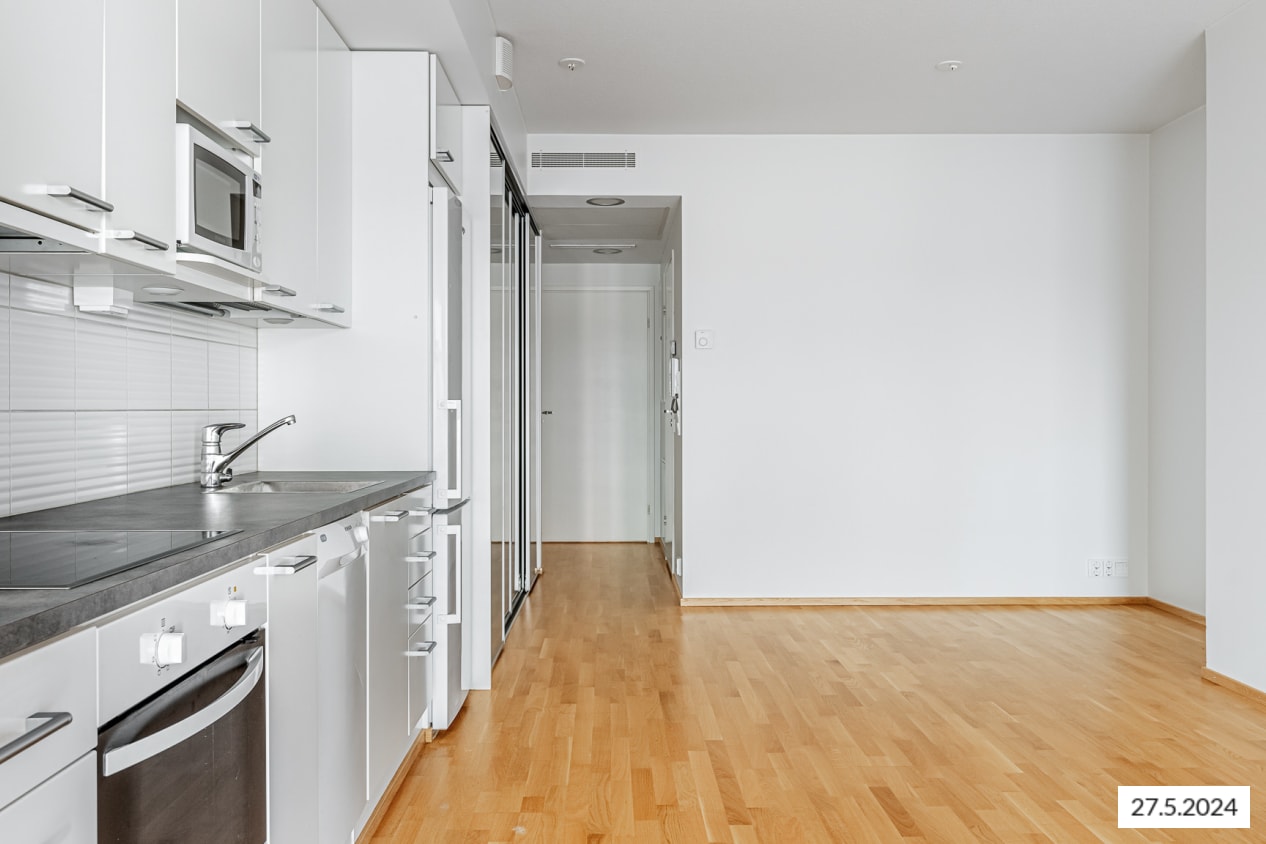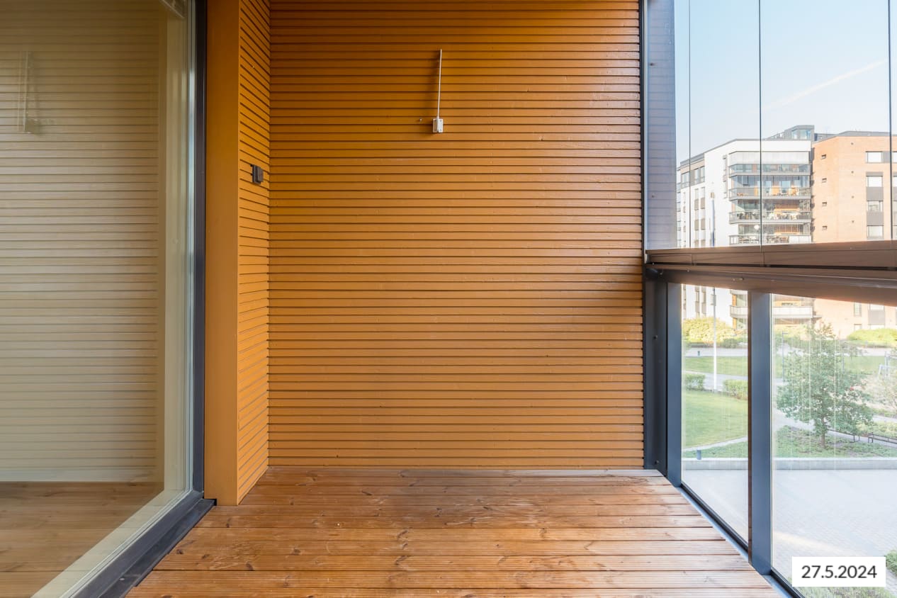 Tässä avara yksiö, jonka olohuone ja avoin keittiötila muodostavat viihtyisän kokonaisuuden. Lisää oleskelutilaa löytyy mukavan kokoiselta lasitetulta parvekkeelta, jonka kaiteet ovat kirkasta lasia ja lattialla on puuritilät. Eteisessä säilytystilaa tarjoaa peililiukuovin varustettu kaapisto.
